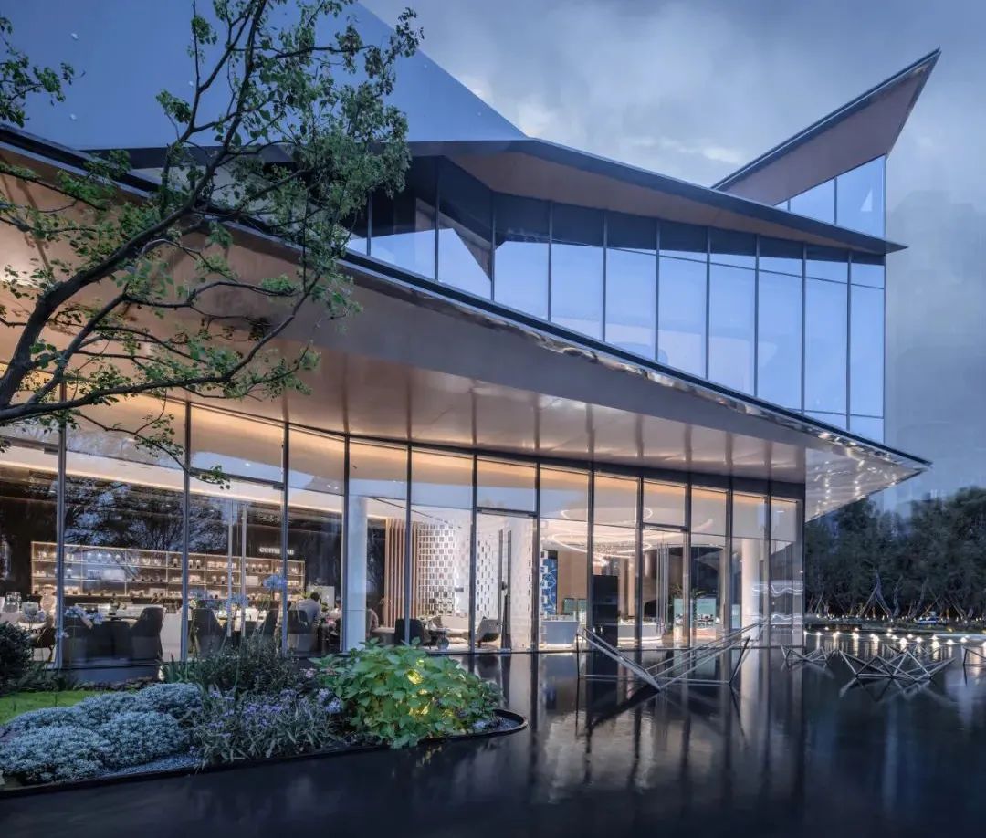 如重慶龍湖云瑤玉陛示范區(qū),底部盒子的設(shè)計(jì)為黑色鏡面鋁板,匍匐并消隱在山坡之上。金屬表皮映襯著光影下的婆娑樹枝,柔和輕盈朦朧的形象展現(xiàn)在眼前。