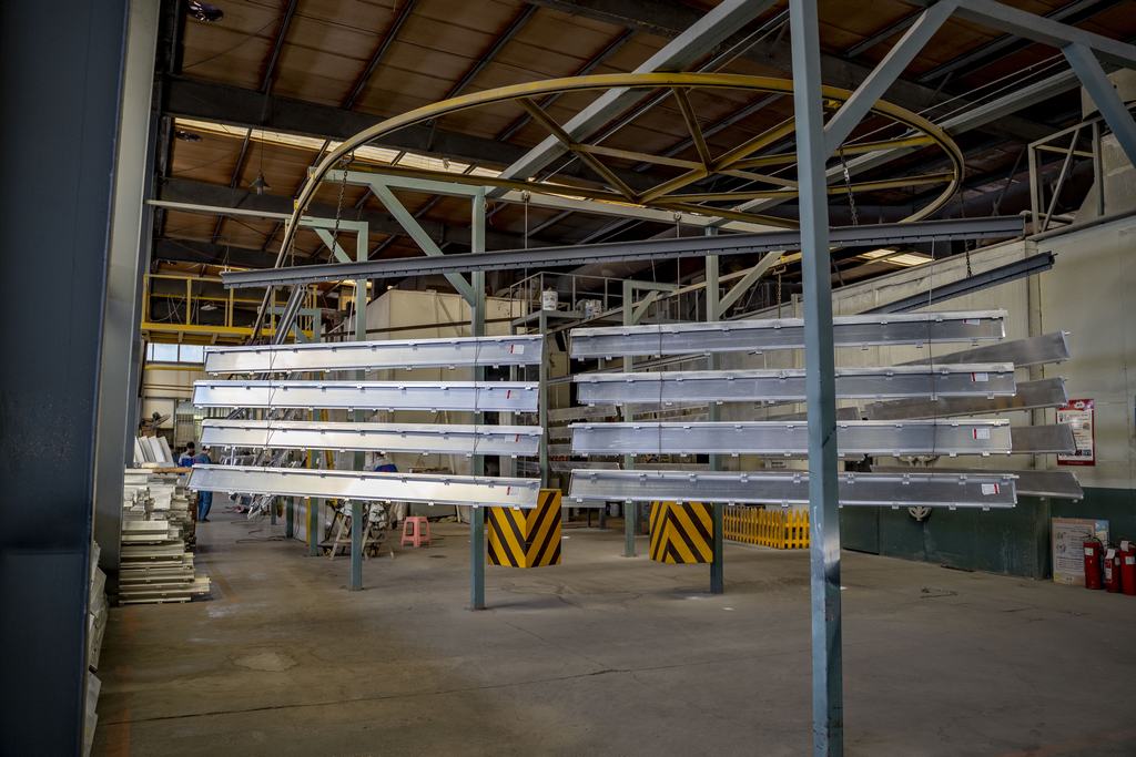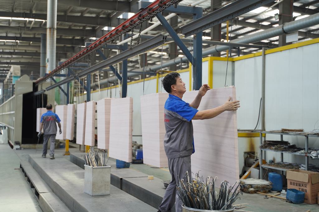 7 掛板 >> 鋁板打磨完下一步就到了噴涂,首先要先把板材上鉤,把鋁板掛于流水線上,我司噴涂車間的噴涂工藝也是比較復(fù)雜的,噴涂前處理表面,就是把鋁板去油去污及化學(xué)處理,上機(jī)等待后續(xù)自動(dòng)傳送。 8 水洗 >> 首先要過(guò)兩道清水,雙面清洗,將鋁板表面的灰塵沖洗干凈。 9 酸堿洗 >> 進(jìn)行酸洗,主要目的把鋁板去油去污,酸洗大概時(shí)間是在10分鐘左右。 10 鉻化 >> 將鋁板鉻化大概5分鐘,以抑制殘余磷化加速劑的腐蝕作用,進(jìn)一步增加防護(hù)能力,有利于延長(zhǎng)漆膜在使用年限。 11 風(fēng)干 >> 將清洗完的鋁板進(jìn)行風(fēng)干。 12 烘干 >> 通入熱氣將鋁板中水分蒸發(fā)并帶走,使鋁板水分全部分散出去進(jìn)行下一步噴涂。 13 噴底漆 >> 底漆涂層,它的作用在于提高我們鋁板涂層的抗?jié)B透能力,然而增強(qiáng)對(duì)底材的保護(hù),穩(wěn)定金屬表面層,加強(qiáng)表面的隨著力,可以使面漆顏色均勻性更強(qiáng)。 14 噴面漆 >> 面漆涂層是噴涂關(guān)鍵的一層,使鋁板需要的顏色外觀達(dá)到設(shè)計(jì)的要求,且保護(hù)板材表面不受環(huán)境的侵蝕,有效防止紫外線穿透,增強(qiáng)抗老化,所以面漆是噴涂中最厚的一層漆層。 15 烤干固化 >> 噴涂后的鋁板將進(jìn)行烤干處理,大概時(shí)候是20分鐘左右,進(jìn)一步鞏固涂層,使鋁單板具有更好的效果。 16 質(zhì)驗(yàn)發(fā)貨 >> 最后一步,鋁單板需接受品控檢驗(yàn),鋁單板外觀、尺寸、膜厚,光澤度附著性等,通過(guò)品控檢驗(yàn)才算成長(zhǎng)為一塊合格的鋁單板。生產(chǎn)出來(lái)的每塊合格鋁單板皆會(huì)被貼上一層保護(hù)膜以防產(chǎn)生剮蹭劃痕。 泡泡膠加乘,四角包邊,雙倍精心防護(hù),出貨,鋁單板加工工藝就完成啦!