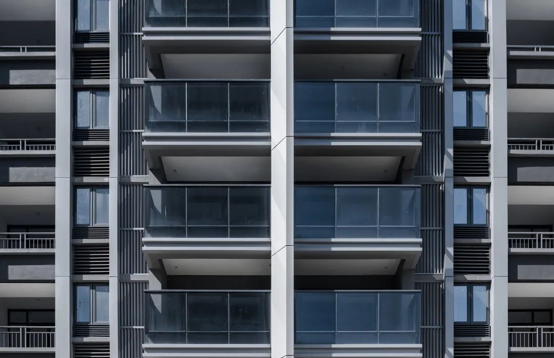 潤達(dá)豐控股 濱江·天樾建筑側(cè)面采用米黃色真石漆與深灰色涂料和深灰色穿孔鋁板結(jié)合,虛與實(shí)的對(duì)比將建筑映襯得干凈、純粹而又輕盈。