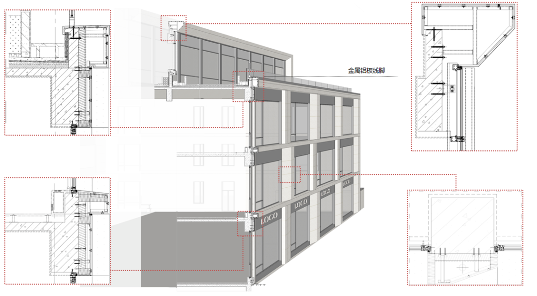 通過滾涂印刷和多次打樣,金麟府選用了效果俱佳、可以假亂真的仿石鋁單板,石材質(zhì)感增添了建筑的細節(jié)表達和價值感,同時也保證了建筑的整體性。