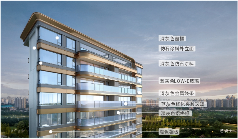 杭州詠汀洲府項(xiàng)目以淺云灰真石漆外立面鑲嵌大面積玻璃窗、輔以鉆石珍珠石材搭配紫磨金鋁板線條,整體在陽光下閃爍著質(zhì)感的光芒,每一個(gè)角度更經(jīng)得起看。