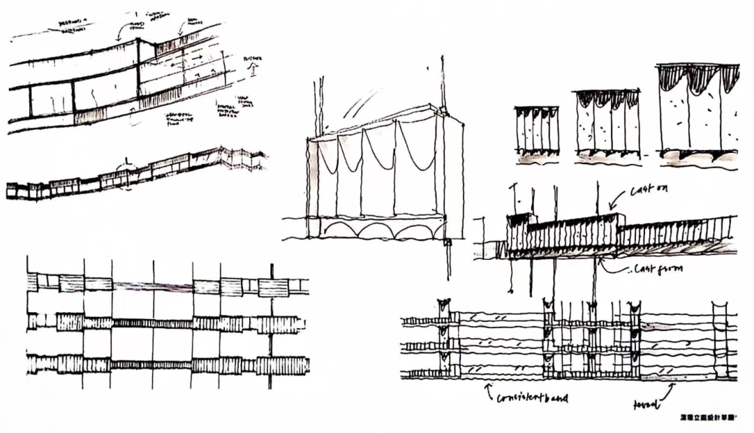 外挑檐和轉(zhuǎn)角立柱支撐的頂面,以及巨大的波浪面體塊,更是一種屋面的意象在立面上延伸。