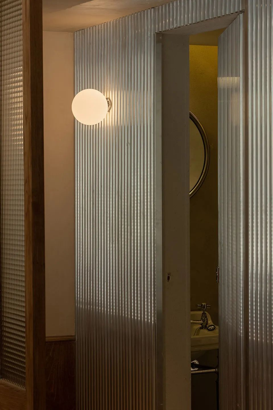外立面使用的材質(zhì),啞面不銹鋼,波浪鋁板,玻璃,陽光板。方管和啞面不銹鋼搭建骨架,不銹鋼移門,陽光板,透明玻璃,完成整體半透明的外殼,如同帳篷的外賬,在夜里點亮只需要微弱的光亮。