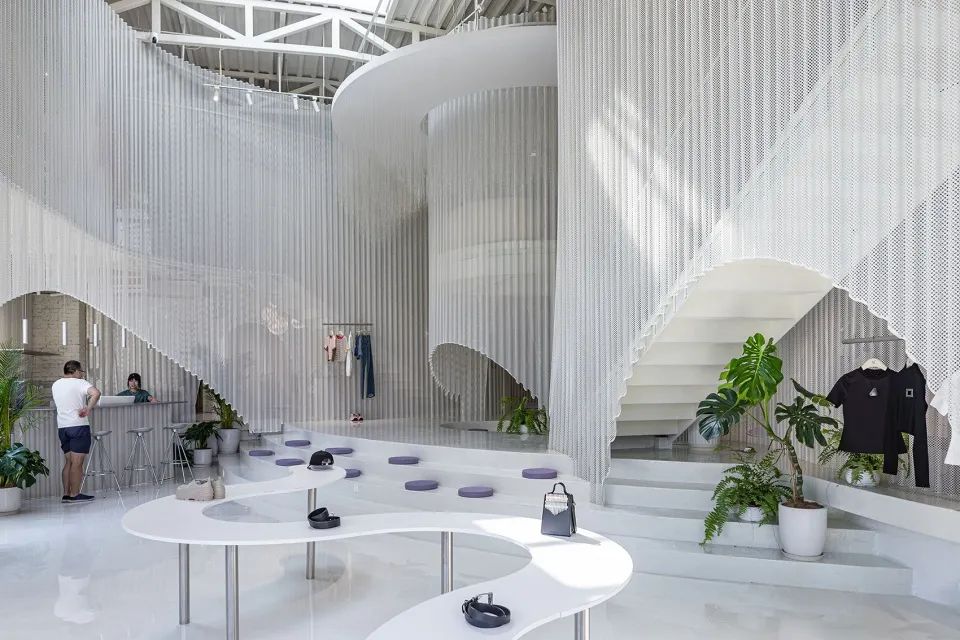 室內(nèi)的波浪板會給人一種層層推進的視覺感,將空間一鏡到底。