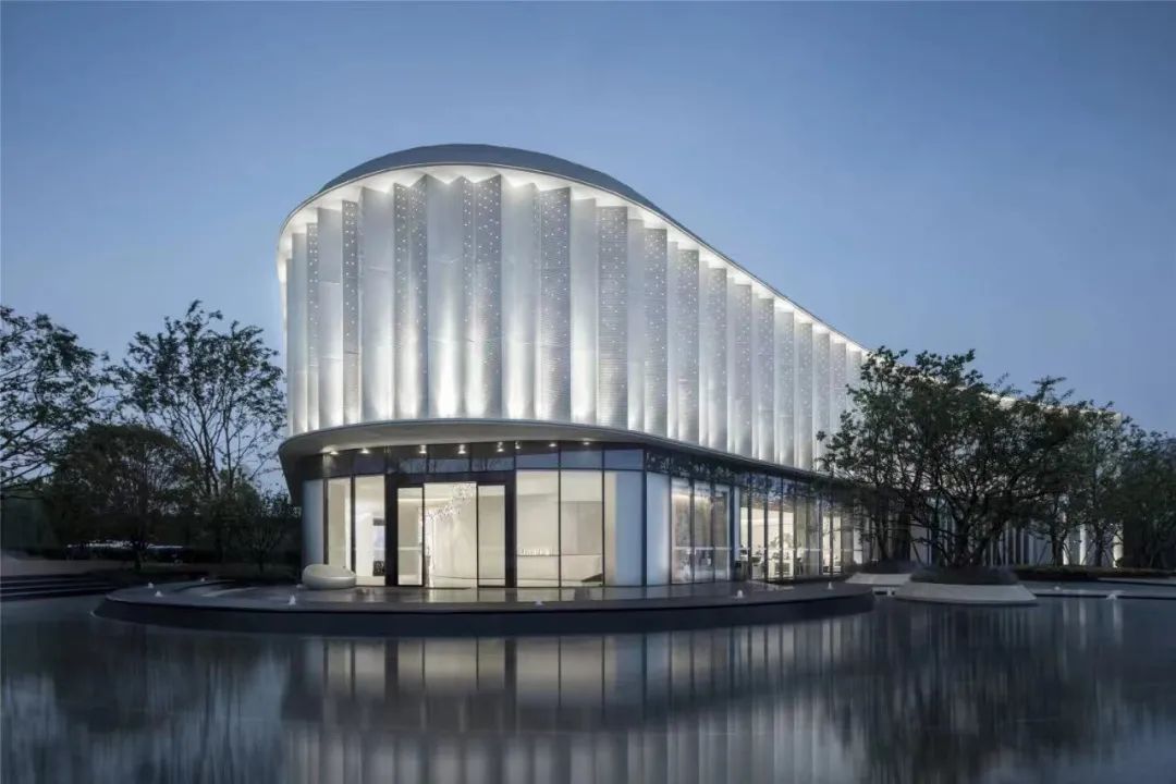 雅居樂&綠地·云和中心示范區(qū)二/三層是懸挑的金屬盒子,采用純白的氟碳噴涂鋁折板,鋁折板通過沖孔板與實板大小變化規(guī)律排列,如同即將啟航的風(fēng)帆。