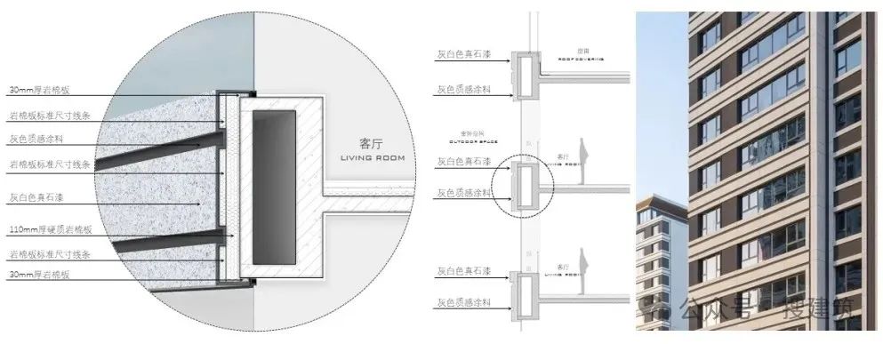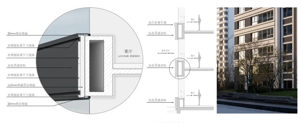 西安中糧·奧體壹號外立面標準段的主材采用了灰白色真石漆與深灰色質感涂料的組合,互為調和,通過深與淺形成的虛實對比達成達成清晰明確的立面線條構成關系,簡潔明快而不失典雅。