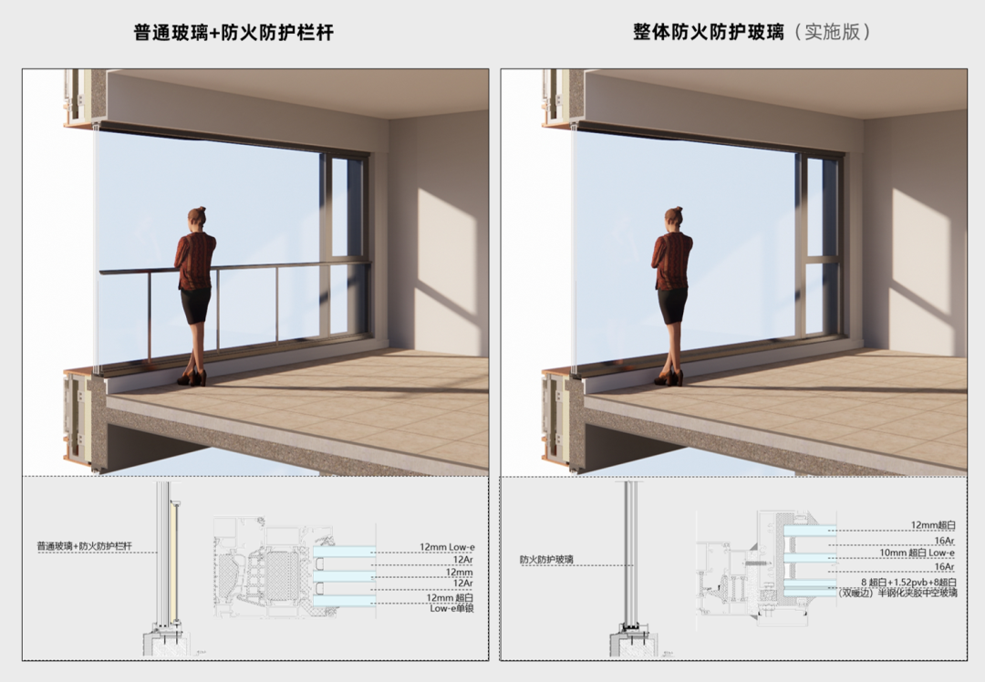 第二種方式,將整個固定扇玻璃都改為了防火玻璃以及鋼化夾膠處理,兼顧防火和防護(hù),從而取消室內(nèi)的防護(hù)欄板??此评速M,但對比第一種防護(hù)欄板的額外的金屬支撐桿件等綜合安裝成本,兩者成本相差無幾。通過對構(gòu)造措施的優(yōu)化調(diào)整,換來了室內(nèi)外更極致的觀賞體驗。