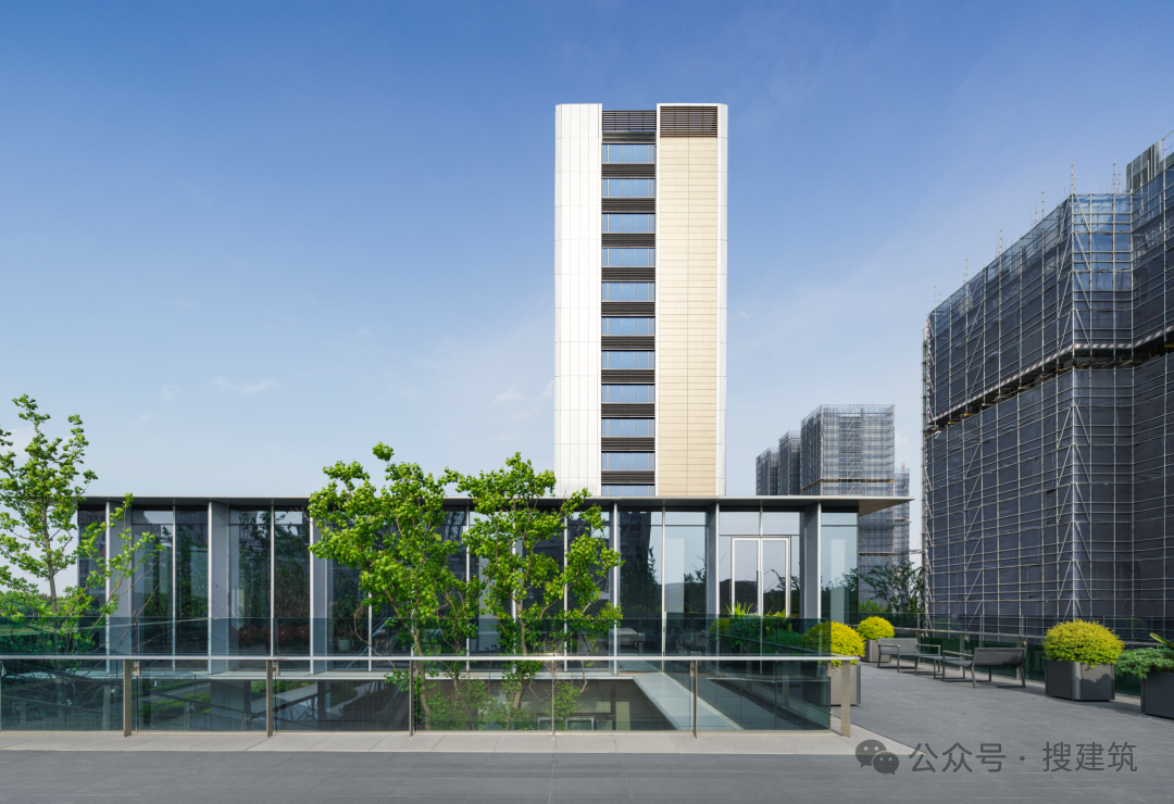 銀灰色鋁板勾勒出建筑形體,木紋色鋁板描畫線條層次,再加上傳統(tǒng)坡屋頂+小披檐元素,讓建筑外立面脫穎而出,不僅提升了整體的顏值和辨識(shí)度,更是使得整座建筑更加溫暖,消解了公建化立面的清冷嚴(yán)肅。再加上三玻兩腔Low-E玻璃,其中單塊玻璃的最大觀景尺度,就達(dá)到了235*150cm。打造出“少梁化”的空間營(yíng)造邏輯,呈現(xiàn)約65%超高窗墻比,使得建筑整體更具通透大氣的現(xiàn)代審美。