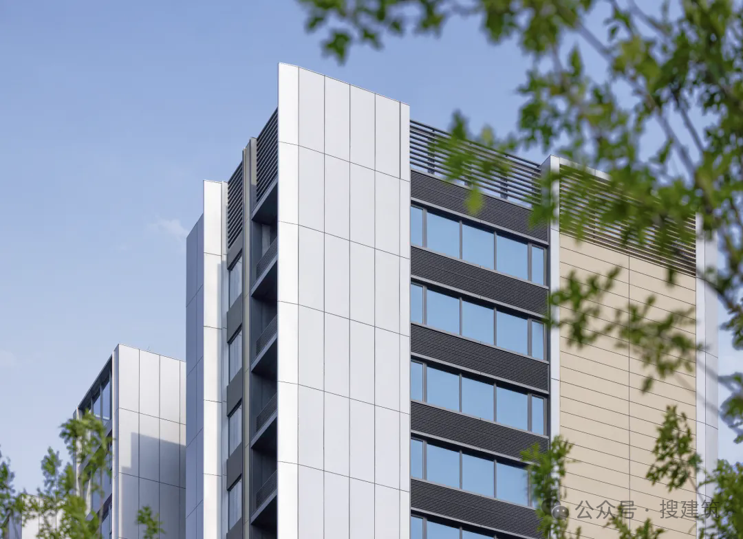 在常見銀色、深灰、米色的外立面顏色中,加入了藍(lán)色進(jìn)行跳色點(diǎn)綴,讓立面更為生動(dòng)。另外外立面還使用LOW-E灰玻璃與豎向機(jī)翼形圓弧鋁板相交融,擴(kuò)大透光面的同時(shí)進(jìn)一步提升了戶與戶之間的隱私性。