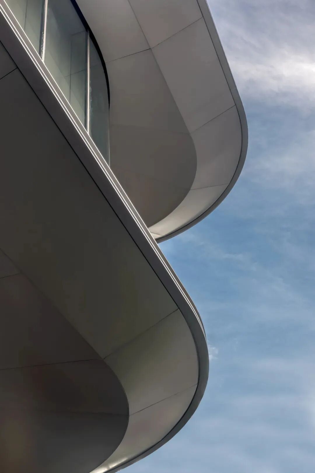 同時(shí)通過(guò)精準(zhǔn)控制鋁板與玻璃的分縫及交接構(gòu)造節(jié)點(diǎn),保證鋁板與玻璃的自然轉(zhuǎn)合交接,使建筑造型具有自由流淌的曲面感,彰顯品質(zhì)與美學(xué)的高度融合。02