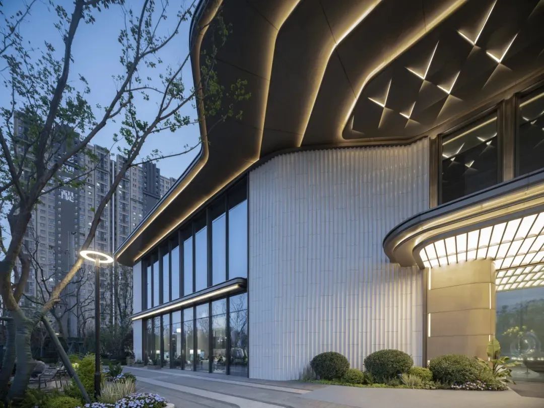 設(shè)計(jì)團(tuán)隊(duì)根據(jù)區(qū)域背景進(jìn)行設(shè)計(jì),提取建筑形態(tài)和符號(hào),項(xiàng)目示范區(qū)售樓處建筑采用對(duì)稱的形體構(gòu)圖,一層灰色石材、古銅色鋁板及金屬線條的使用,營(yíng)造出酒店般奢華尊貴感受;二層弧面玻璃、淺色鋁板又形成輕盈時(shí)尚的氣質(zhì)。