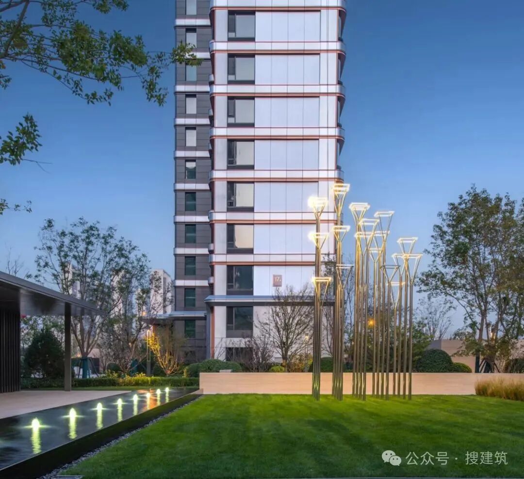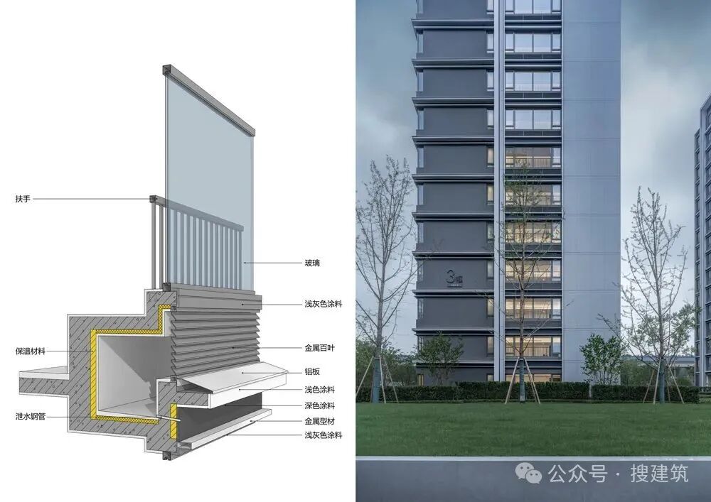 比如,杭州融創(chuàng)·云潮府在山墻面增加了涂料和金屬兩種材質(zhì),使得形體層次更加清晰豐富。而為了提升涂料面的精致度,優(yōu)化了節(jié)點設(shè)計,以U形金屬嵌槽代替涂料分縫,塑造金屬板材劃分的效果,化解了大面涂料的突兀感。