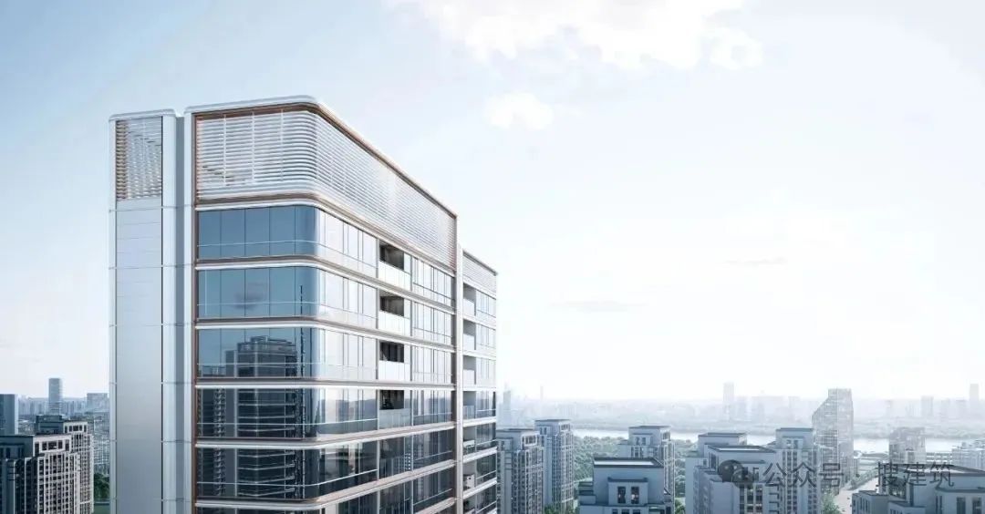 潤達豐控股 濱江·天樾建筑側(cè)面采用米黃色真石漆與深灰色涂料和深灰色穿孔鋁板結(jié)合,虛與實的對比將建筑映襯得干凈、純粹而又輕盈。