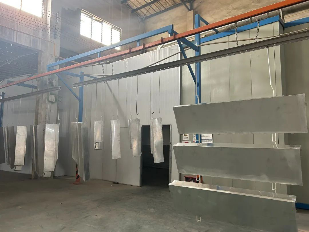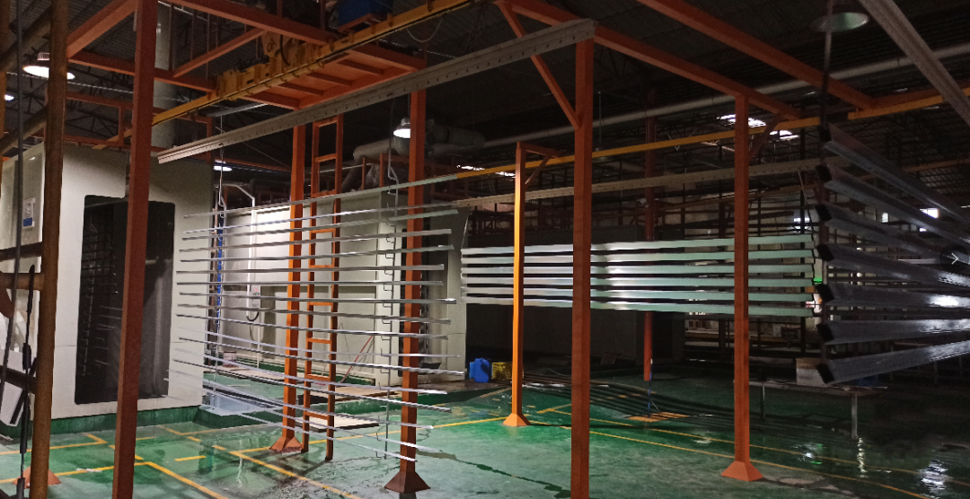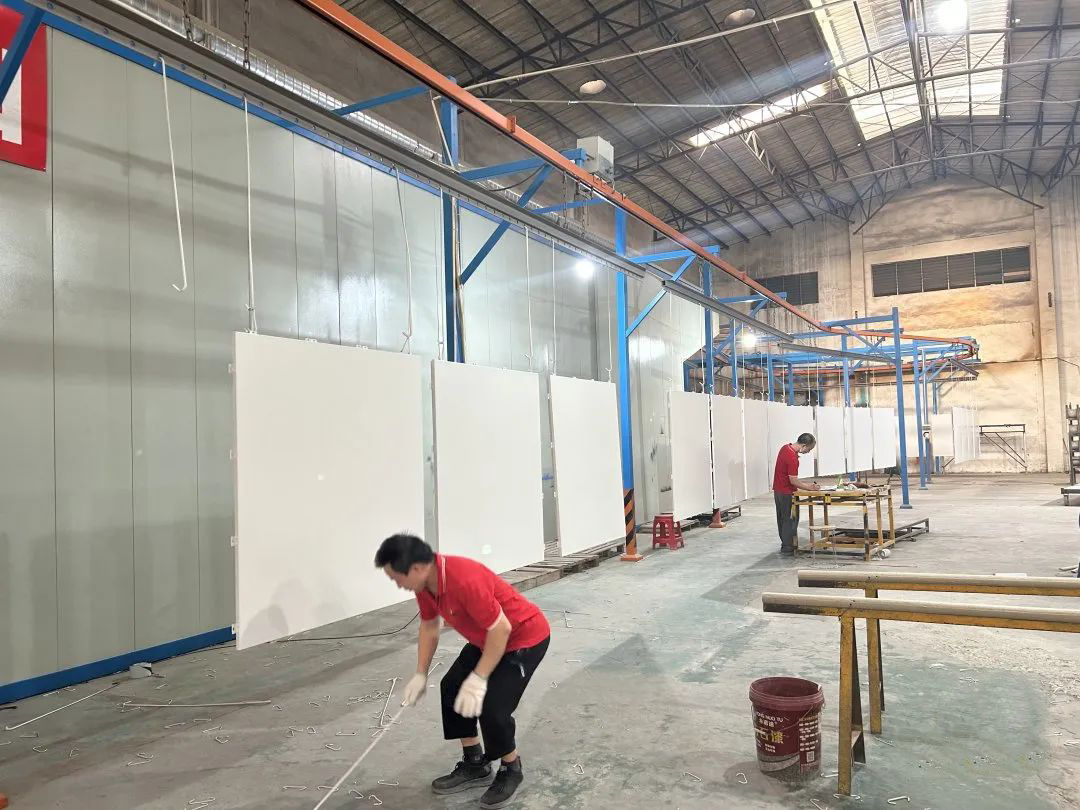 7 掛板 >> 鋁板打磨完下一步就到了噴涂,首先要先把板材上鉤,把鋁板掛于流水線上,我司噴涂車間的噴涂工藝也是比較復(fù)雜的,噴涂前處理表面,就是把鋁板去油去污及化學(xué)處理,上機(jī)等待后續(xù)自動(dòng)傳送。 8 水洗 >> 首先要過(guò)兩道清水,雙面清洗,將鋁板表面的灰塵沖洗干凈。 9 酸堿洗 >> 進(jìn)行酸洗,主要目的把鋁板去油去污,酸洗大概時(shí)間是在10分鐘左右。 10 鉻化 >> 將鋁板鉻化大概5分鐘,以抑制殘余磷化加速劑的腐蝕作用,進(jìn)一步增加防護(hù)能力,有利于延長(zhǎng)漆膜在使用年限。 11 風(fēng)干 >> 將清洗完的鋁板進(jìn)行風(fēng)干。 12 烘干 >> 通入熱氣將鋁板中水分蒸發(fā)并帶走,使鋁板水分全部分散出去進(jìn)行下一步噴涂。 13 噴底漆 >> 底漆涂層,它的作用在于提高我們鋁板涂層的抗?jié)B透能力,然而增強(qiáng)對(duì)底材的保護(hù),穩(wěn)定金屬表面層,加強(qiáng)表面的隨著力,可以使面漆顏色均勻性更強(qiáng)。 14 噴面漆 >> 面漆涂層是噴涂關(guān)鍵的一層,使鋁板需要的顏色外觀達(dá)到設(shè)計(jì)的要求,且保護(hù)板材表面不受環(huán)境的侵蝕,有效防止紫外線穿透,增強(qiáng)抗老化,所以面漆是噴涂中最厚的一層漆層。 15 烤干固化 >> 噴涂后的鋁板將進(jìn)行烤干處理,大概時(shí)候是20分鐘左右,進(jìn)一步鞏固涂層,使鋁單板具有更好的效果。 16 質(zhì)驗(yàn)發(fā)貨 >> 最后一步,鋁單板需接受品控檢驗(yàn),鋁單板外觀、尺寸、膜厚,光澤度附著性等,通過(guò)品控檢驗(yàn)才算成長(zhǎng)為一塊合格的鋁單板。生產(chǎn)出來(lái)的每塊合格鋁單板皆會(huì)被貼上一層保護(hù)膜以防產(chǎn)生剮蹭劃痕。 泡泡膠加乘,四角包邊,雙倍精心防護(hù),出貨,鋁單板加工工藝就完成啦!
