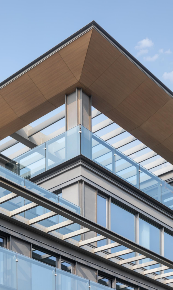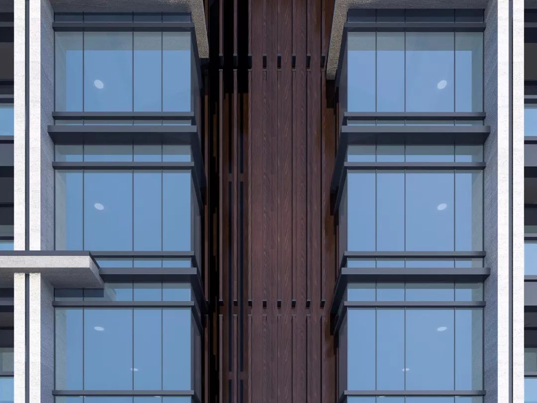 上海中駿·天璟采用深色的木紋鋁板,有一種厚重的高貴氣質(zhì)。