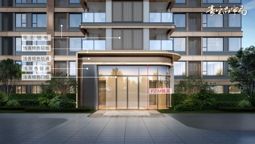香港置地·西元項目出現(xiàn)在主立面的鋁單板和鋁制線條在背立面同樣存在,單元門頭由全鋁板包裹。