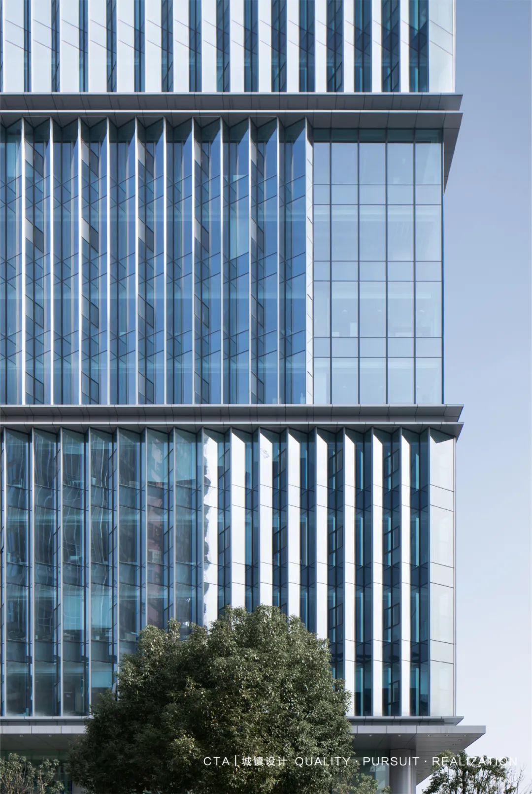 幕墻創(chuàng)造性地采用整層高的玻璃劃分豎向網(wǎng)格狀的明框玻璃,有效減少西側(cè)太陽的直射影響,顯著降低高層建筑能耗,室內(nèi)視野開闊,純凈通透,營造更高品質(zhì)的室內(nèi)辦公空間。