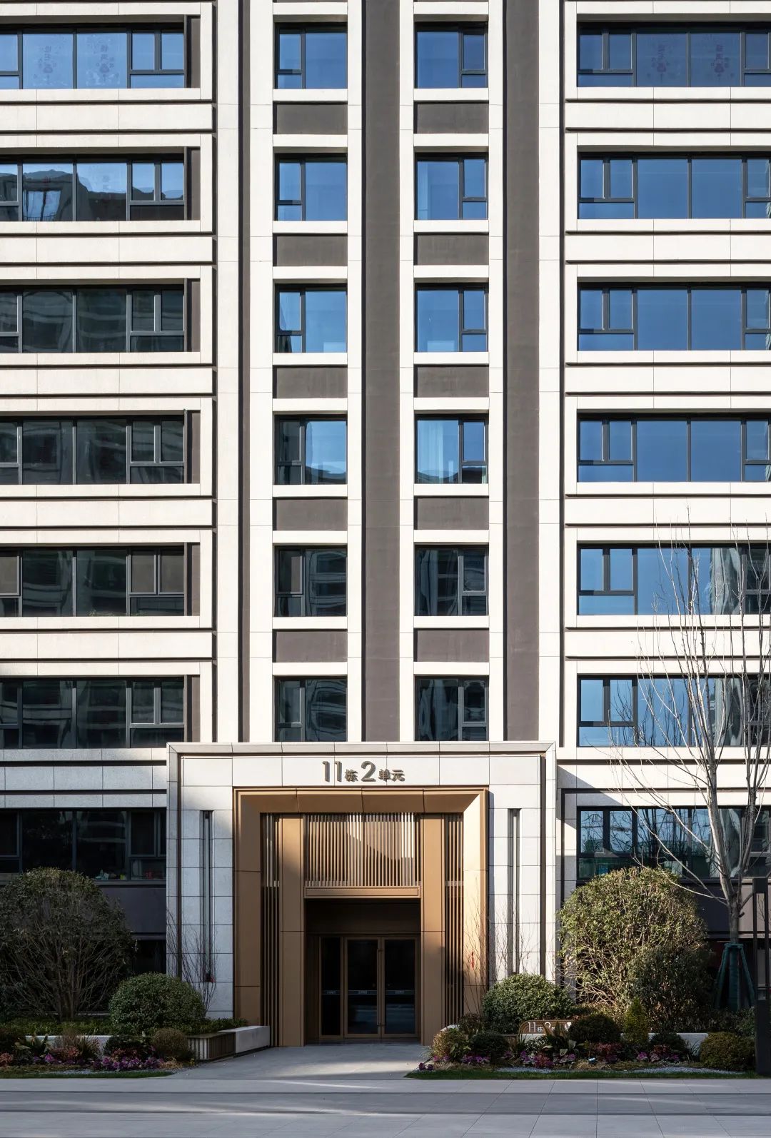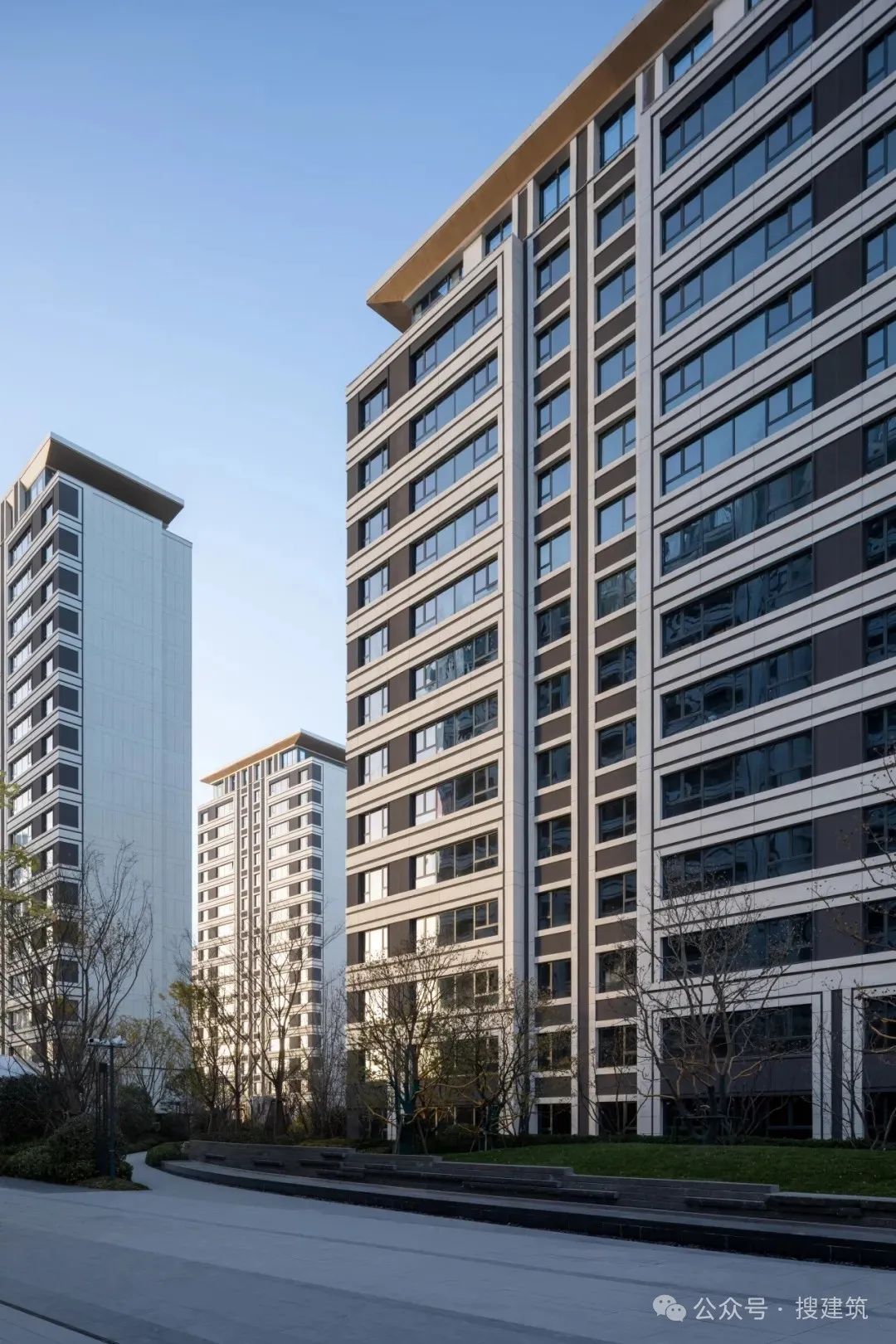西安中糧·奧體壹號外立面標準段的主材采用了灰白色真石漆與深灰色質感涂料的組合,互為調和,通過深與淺形成的虛實對比達成達成清晰明確的立面線條構成關系,簡潔明快而不失典雅。