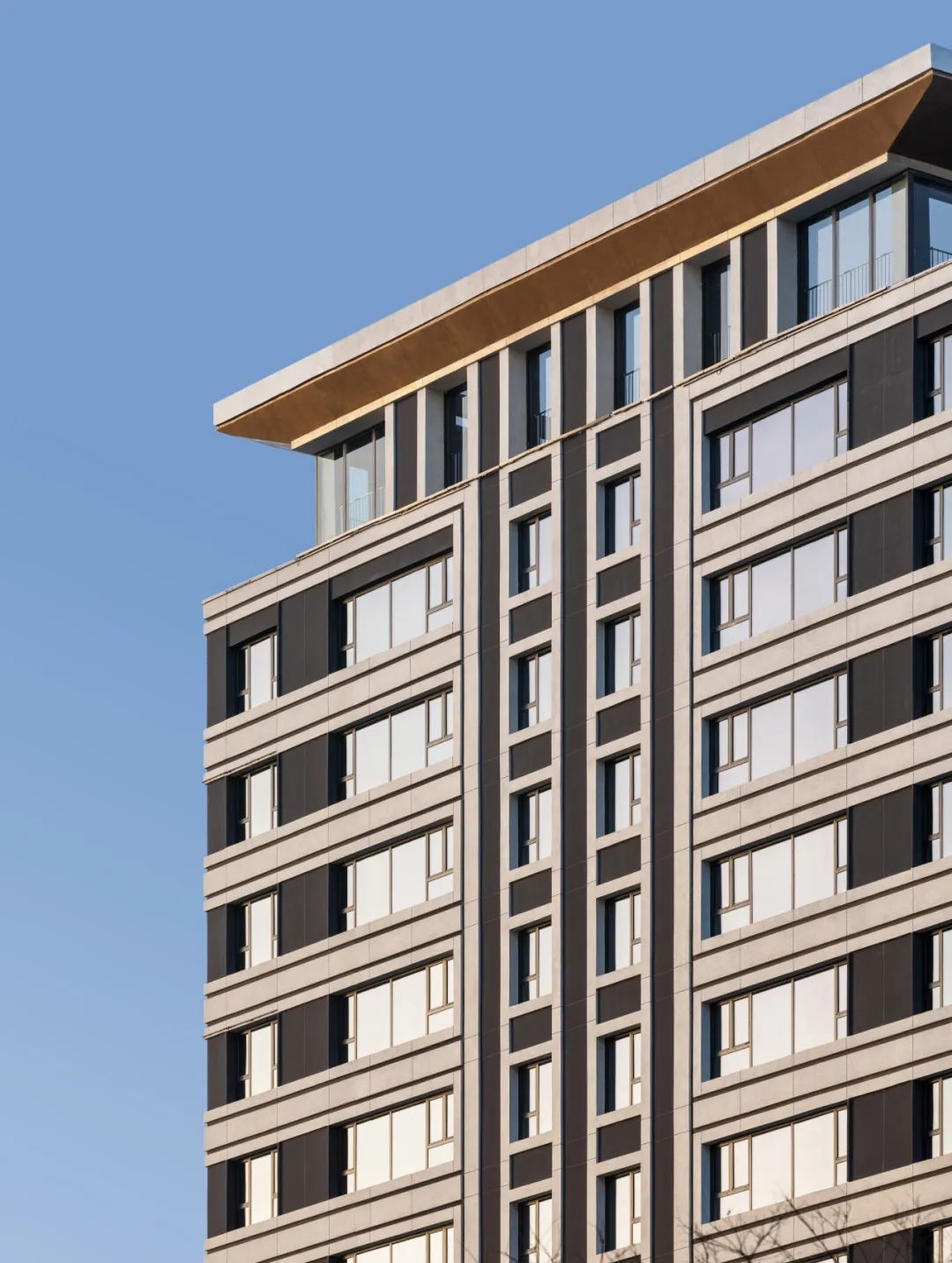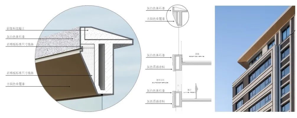頂部的面層則是選用了輕質的輕集料混凝土與灰白色真石漆的組合,搭配斜切立面的古銅色金屬漆,讓屋頂結構更幾何、立體,視覺上更加輕盈,優(yōu)雅且靈動。