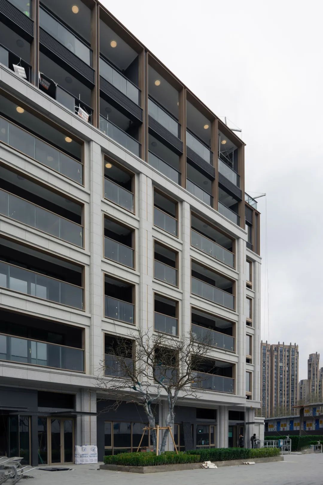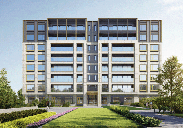 杭州華潤置地·珹上潤府建筑以淺色真石漆配搭香檳金線條做為主體語言,在住宅頂部采用工業(yè)風鋁板金屬造型,增加其細節(jié)感;并在陽臺處壁柱增加碧柱造型,豐富立面層次,營造古典的調性。