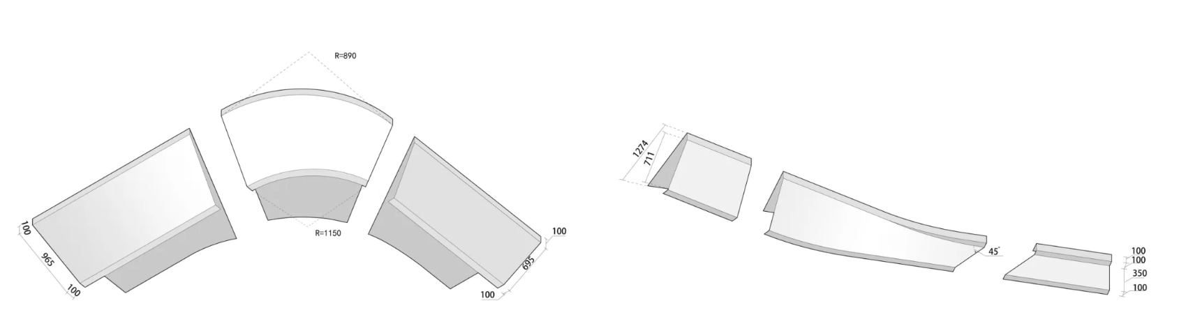 設(shè)計(jì)團(tuán)隊(duì)通過模數(shù)控制對(duì)構(gòu)件進(jìn)行梳理:玻璃欄板,扶手,鋁板等不同材料進(jìn)行對(duì)縫設(shè)計(jì),玻璃欄板劃分間距1.5m,一塊玻璃欄板對(duì)應(yīng)一塊鋁板,進(jìn)行標(biāo)準(zhǔn)化設(shè)計(jì);調(diào)板弧線尺寸、弧面玻璃倒角尺寸進(jìn)行統(tǒng)一,弧形挑板被進(jìn)一步拆解為,收邊型材,上斜面,下斜面,弧形轉(zhuǎn)角等構(gòu)件,進(jìn)行模塊化分解。
