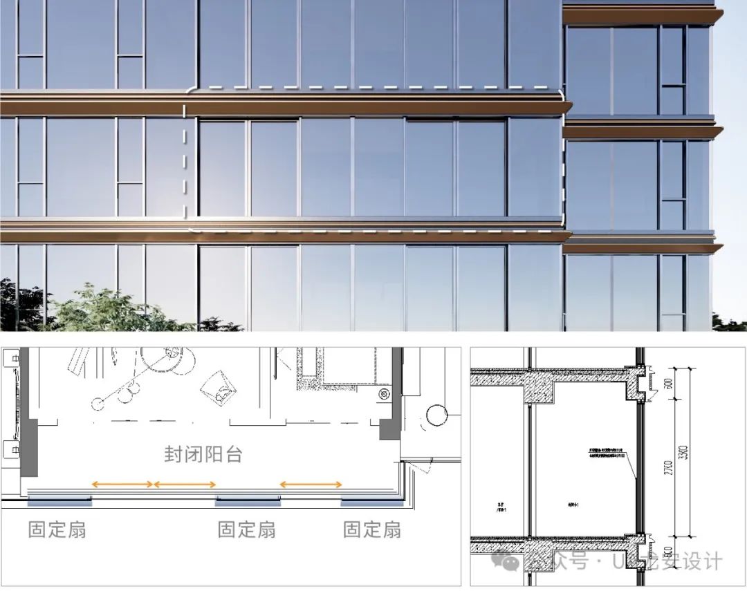 第二種方式,將整個固定扇玻璃都改為了防火玻璃以及鋼化夾膠處理,兼顧防火和防護(hù),從而取消室內(nèi)的防護(hù)欄板??此评速M,但對比第一種防護(hù)欄板的額外的金屬支撐桿件等綜合安裝成本,兩者成本相差無幾。通過對構(gòu)造措施的優(yōu)化調(diào)整,換來了室內(nèi)外更極致的觀賞體驗。