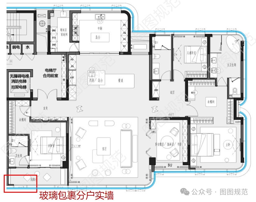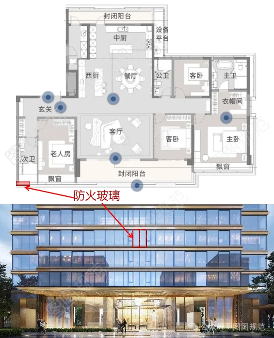 以下圖來看(具體做法不詳),透過下圖我們可以分析,如果為了達(dá)到完全的通透,也可以在老人房次衛(wèi)將飄窗固定扇使用耐火完整性和耐火隔熱性均達(dá)到1.0h的防火玻璃,來滿足水平方向防火分隔要求。