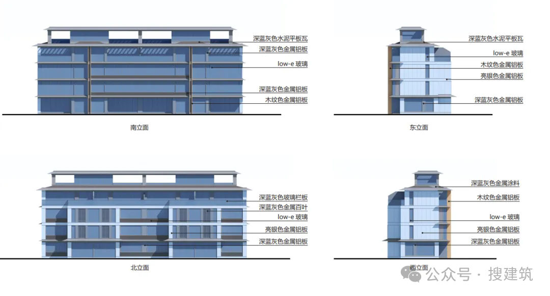 在常見銀色、深灰、米色的外立面顏色中,加入了藍(lán)色進(jìn)行跳色點(diǎn)綴,讓立面更為生動(dòng)。