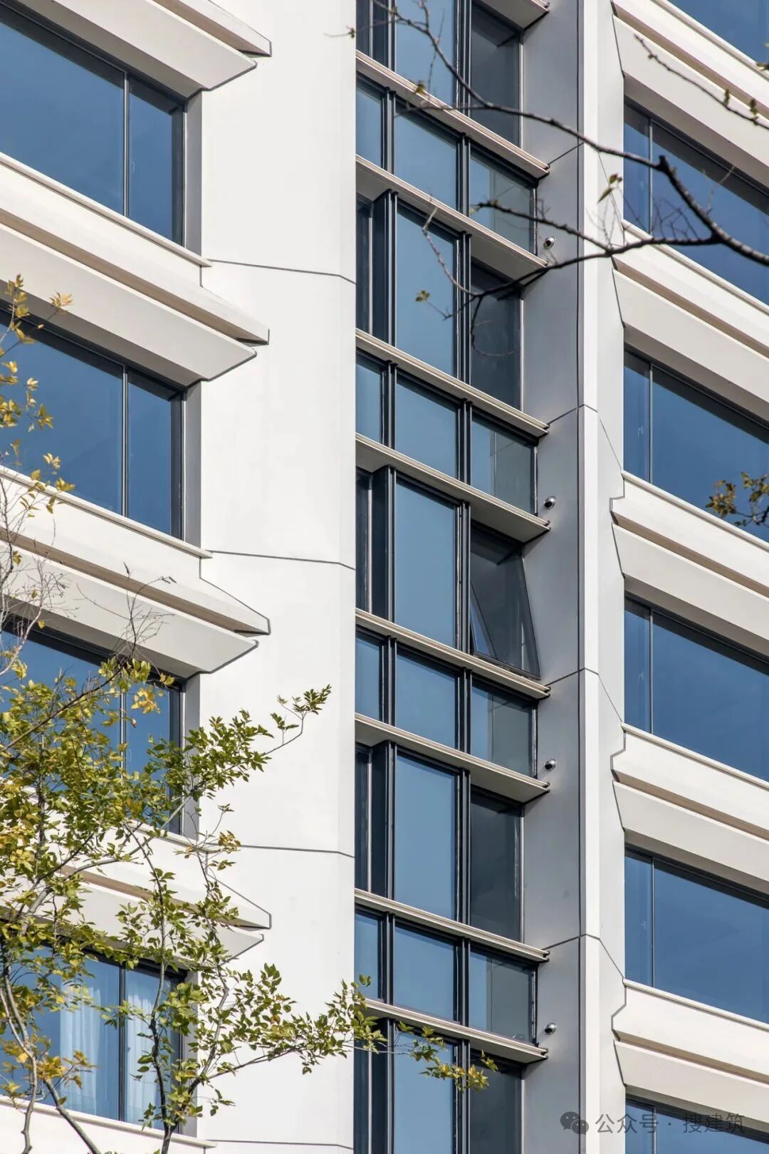 建筑中部采用偏暖色仿石材紋理的鋁板,并在鋁板上做了細(xì)節(jié)凹槽處理,通過這些細(xì)節(jié)提升建筑整體的溫度,使得整體建筑形象更加溫暖近人。
