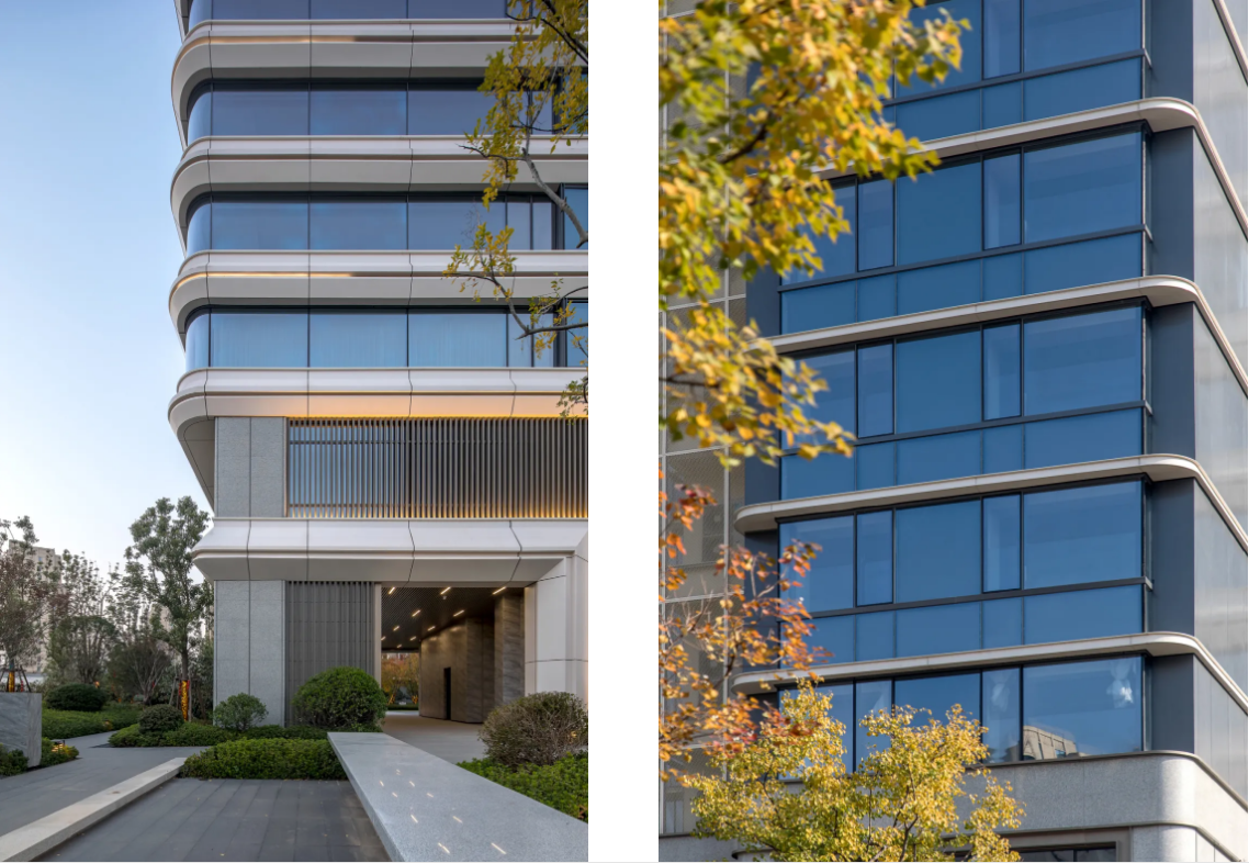 為了實(shí)現(xiàn)這種暖光感,九廬的3000K色溫立面,同樣都選用暖色調(diào),選材也以更親人的材料為主,大量選用鋁板,甄選米白色仿石鋁板、仿銅香檳金鋁板、深灰色線條鋁板,再加上冷灰色low-E玻璃幕墻,冷暖配色碰撞,獨(dú)具辨識度。與此同時(shí),配以3000k色溫鋁板,給人營造出溫暖歸家的感受,視覺上更典雅、更舒適。