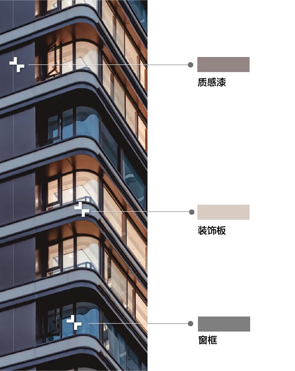 ● 暖色局部作為輔助、點(diǎn)綴,打破立面冰冷感,以平衡整體視覺效果,同時(shí)增添立面的層次感和精致感?。