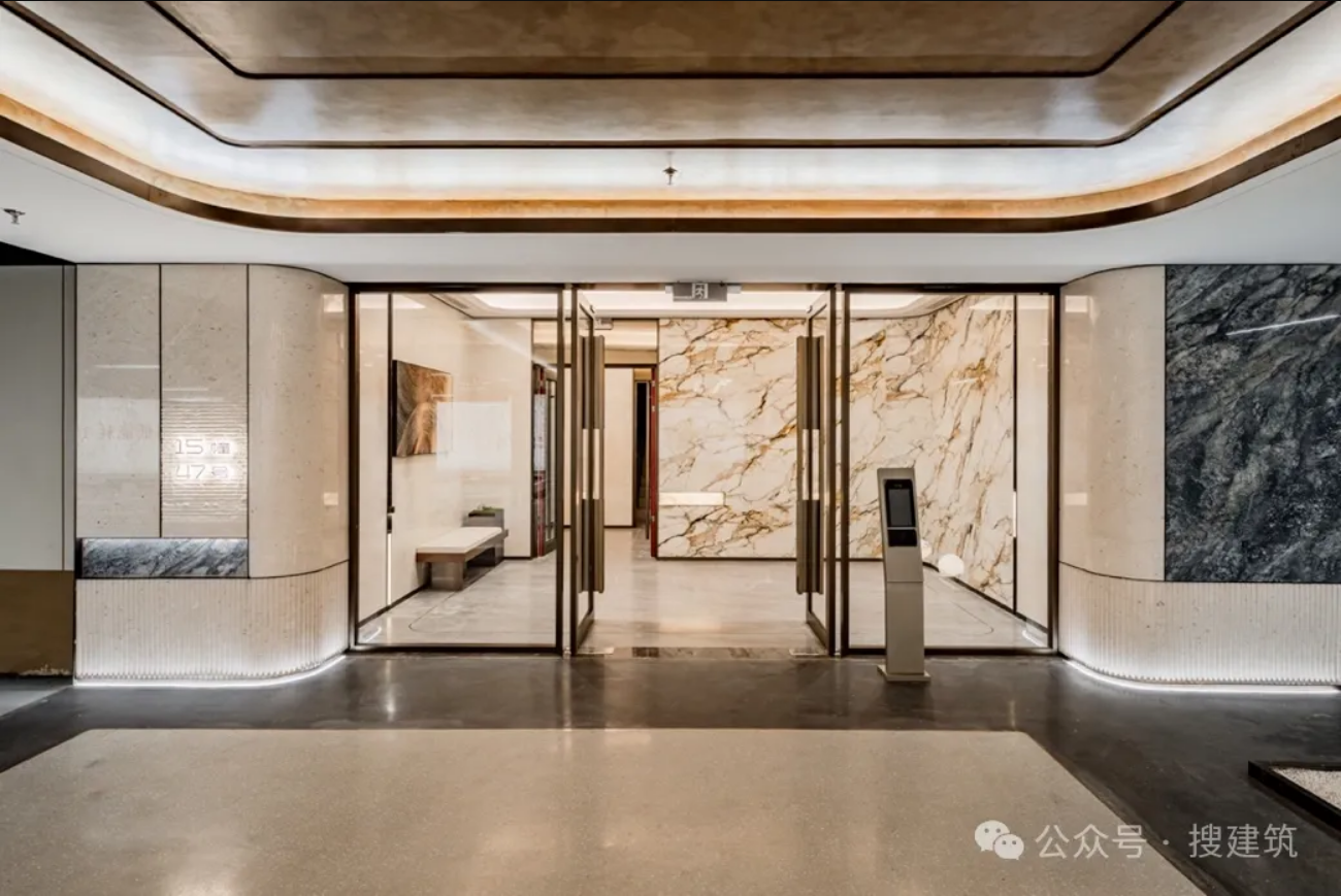 蘇州中信泰富玖著云庭地下大堂約4.15米的層高,盡顯尊貴。地面鋪以高端仿石瓷磚,墻面是巖板作為背景墻,高級(jí)感滿滿。