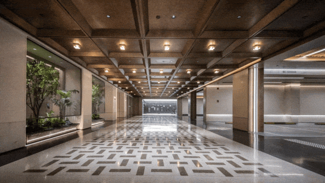 鄭州金橋西棠負(fù)一層地庫(kù)大堂建筑層高約5.55米,負(fù)二層地庫(kù)大堂建筑層高約3.8米,以高通透的平開(kāi)感應(yīng)落地玻璃門提升空間尺度和格調(diào)。