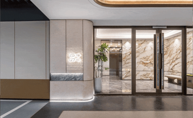 保利博雅和著高顏值地下入庫(kù)大堂不銹鋼電動(dòng)移門搭配局部平開(kāi)門,美觀、好用。大堂內(nèi)采用仿古不銹鋼仿白洞石石材巖板墻面,還貼心設(shè)置休憩區(qū)。