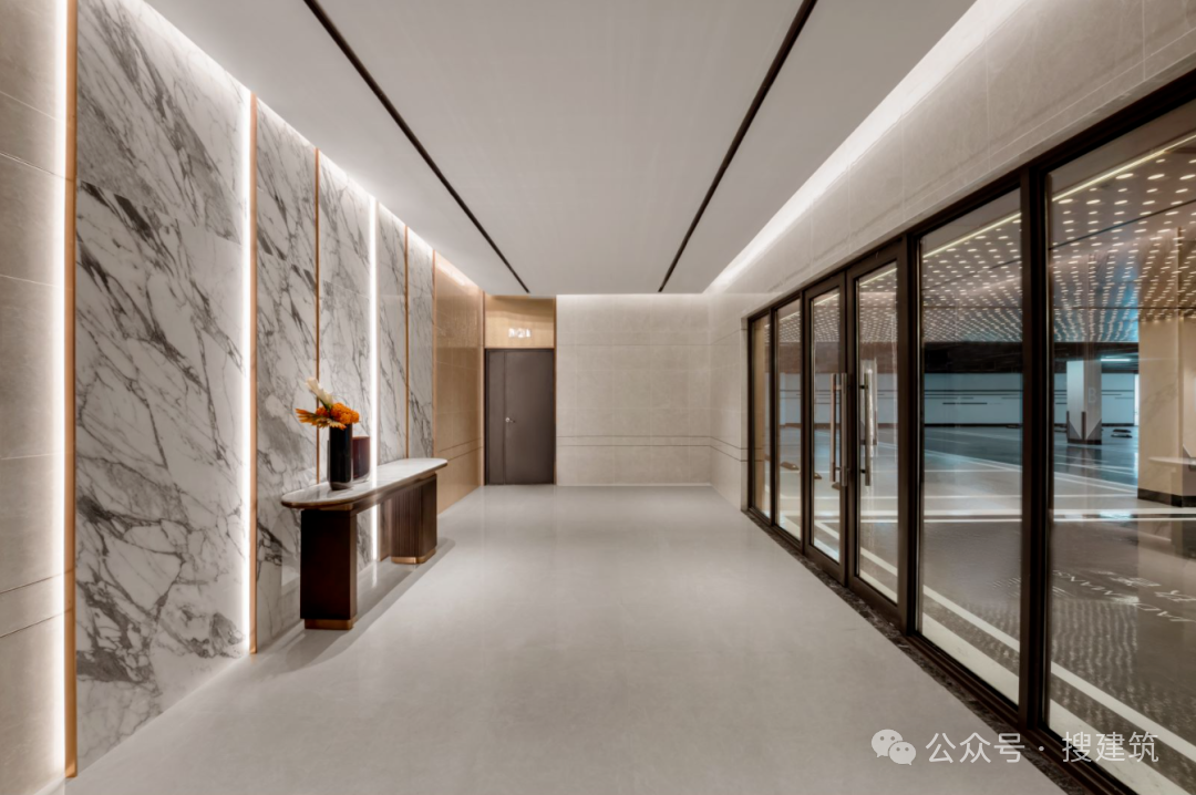 在地庫(kù)大堂的美學(xué)營(yíng)造上,考慮到將所有質(zhì)感與審美結(jié)合,特別定制優(yōu)雅的奢材,打造充滿律動(dòng)而又富有美學(xué)的空間感受。