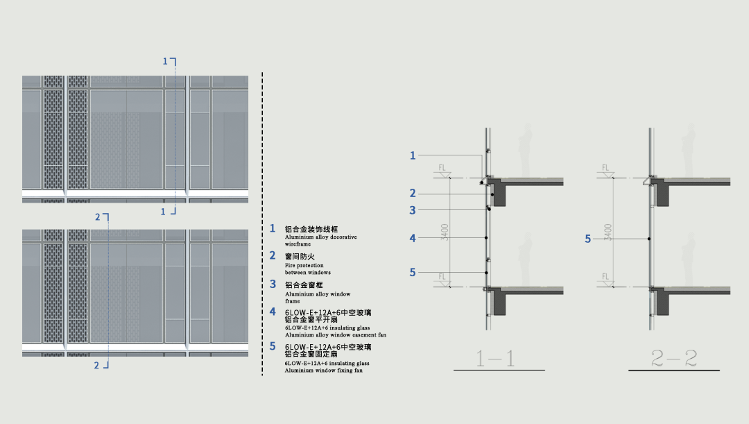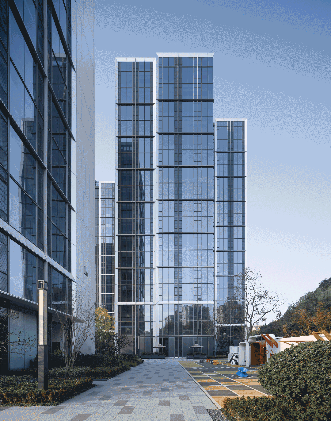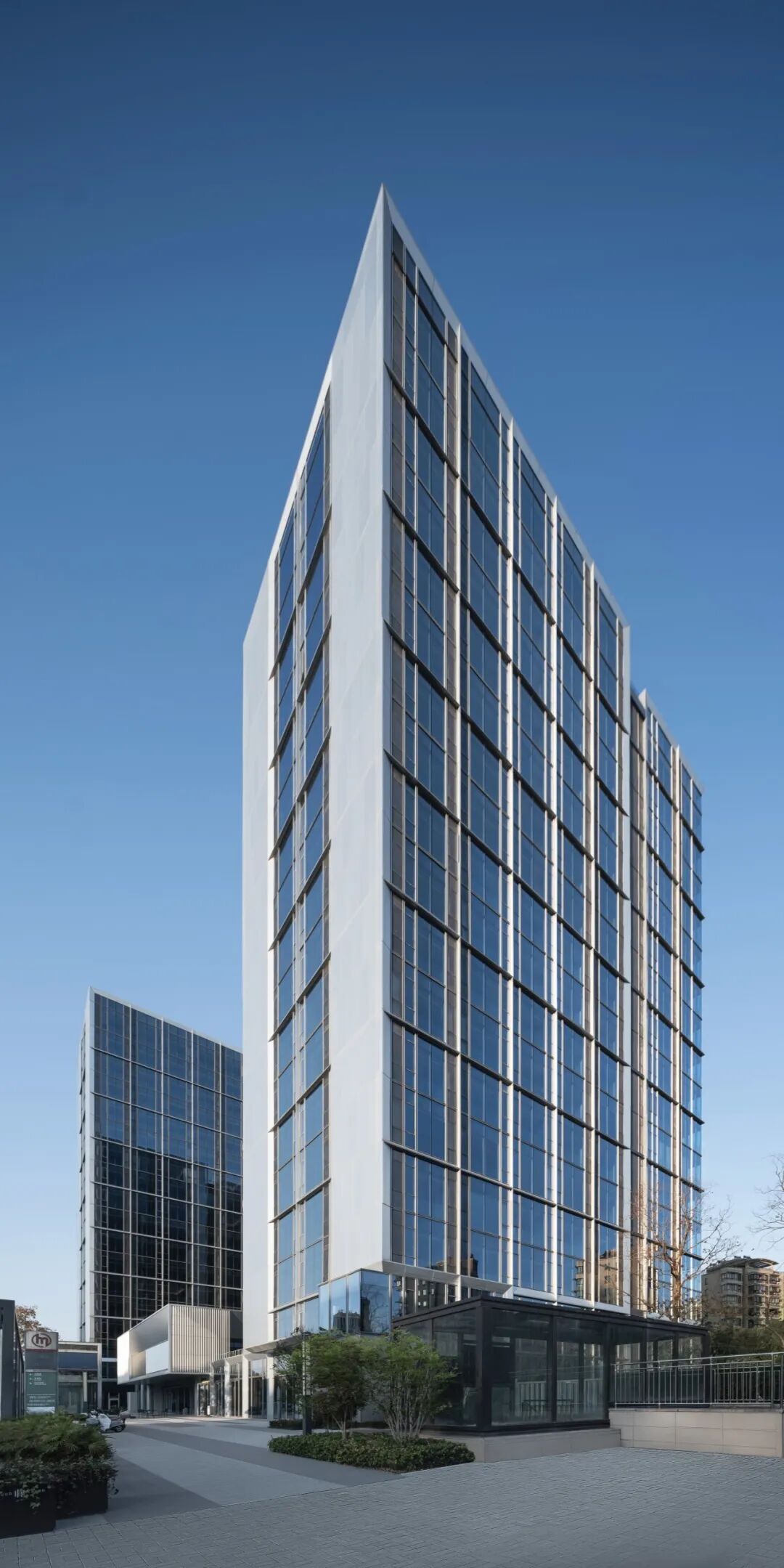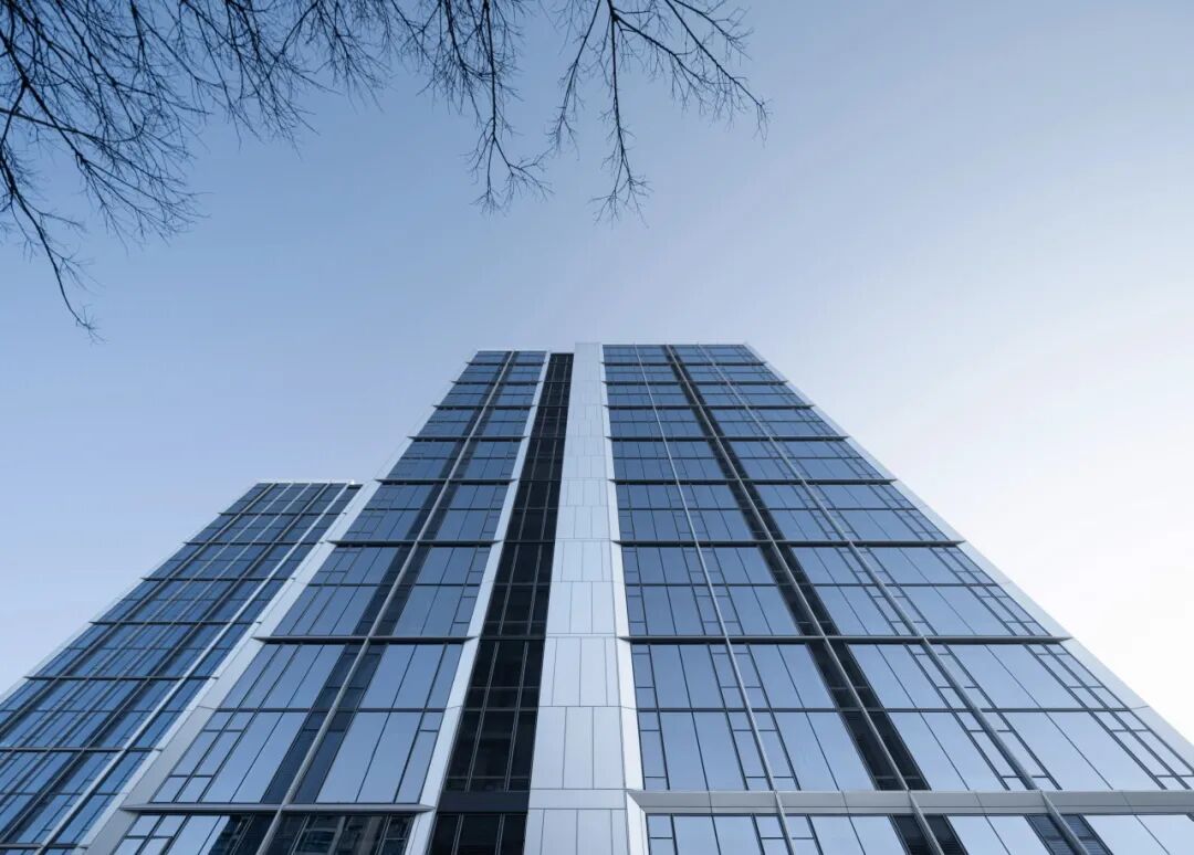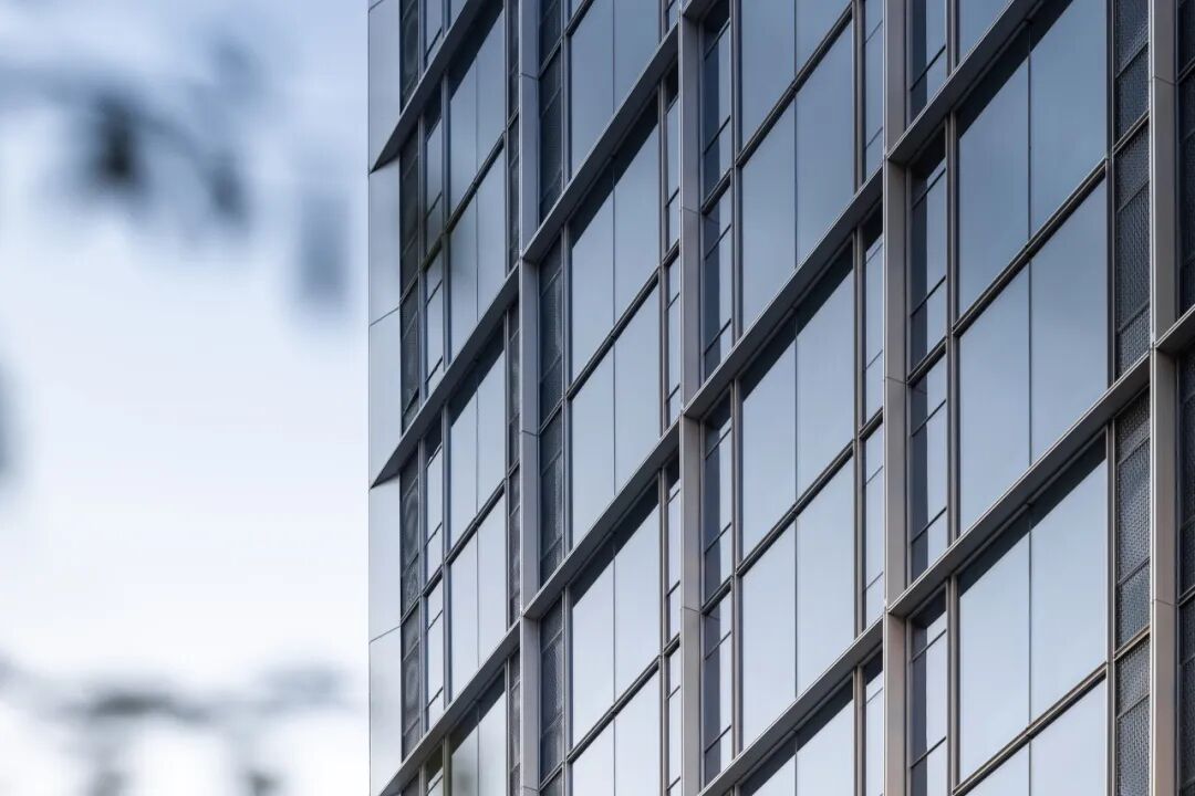 在住宅建筑周遭,精心規(guī)劃的100米緩沖區(qū)內(nèi),面向家園的每一寸建筑肌膚皆被賦予了細(xì)膩考量——摒棄了冷硬的全玻璃幕墻,取而代之的是窗墻體系,其設(shè)計(jì)靈感源自于幕墻的美學(xué)精髓,卻又巧妙地融入了溫暖的人文關(guān)懷。外立面以大面積玻璃搭配斜切45°的銀灰色金屬鋁板干掛和冷灰色穿孔鋁板,遠(yuǎn)觀如鉆石切面般閃爍在陽(yáng)光下,如銀河傾瀉而下。
