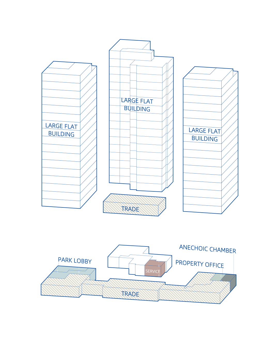 這一設(shè)計(jì)巧思不僅與整體建筑的斜切工藝形成呼應(yīng),更以一種不對(duì)稱均衡的美學(xué)秩序,重構(gòu)了門頭與主樓之間的關(guān)系。兩者間仿佛存在著一種微妙而強(qiáng)烈的張力,彼此吸引又各自獨(dú)立,共同構(gòu)建了一幅層次分明、意趣橫生的城市空間圖景。