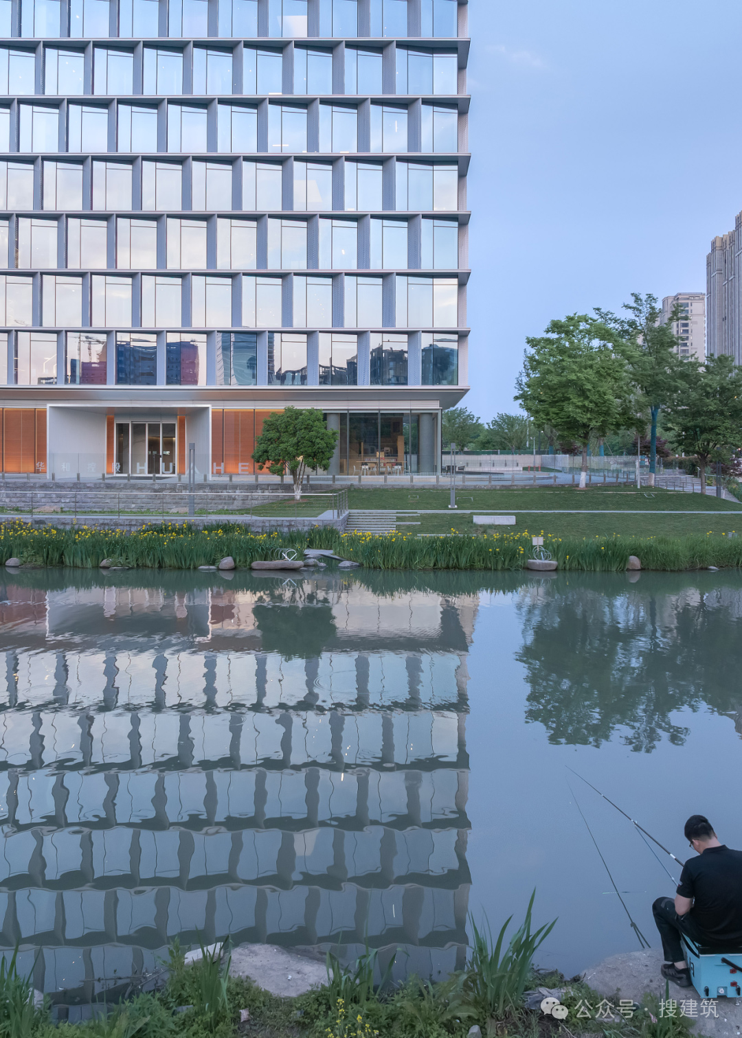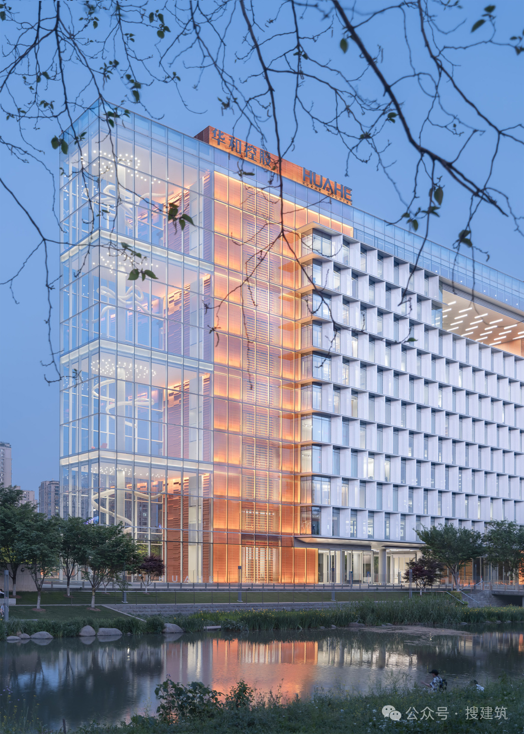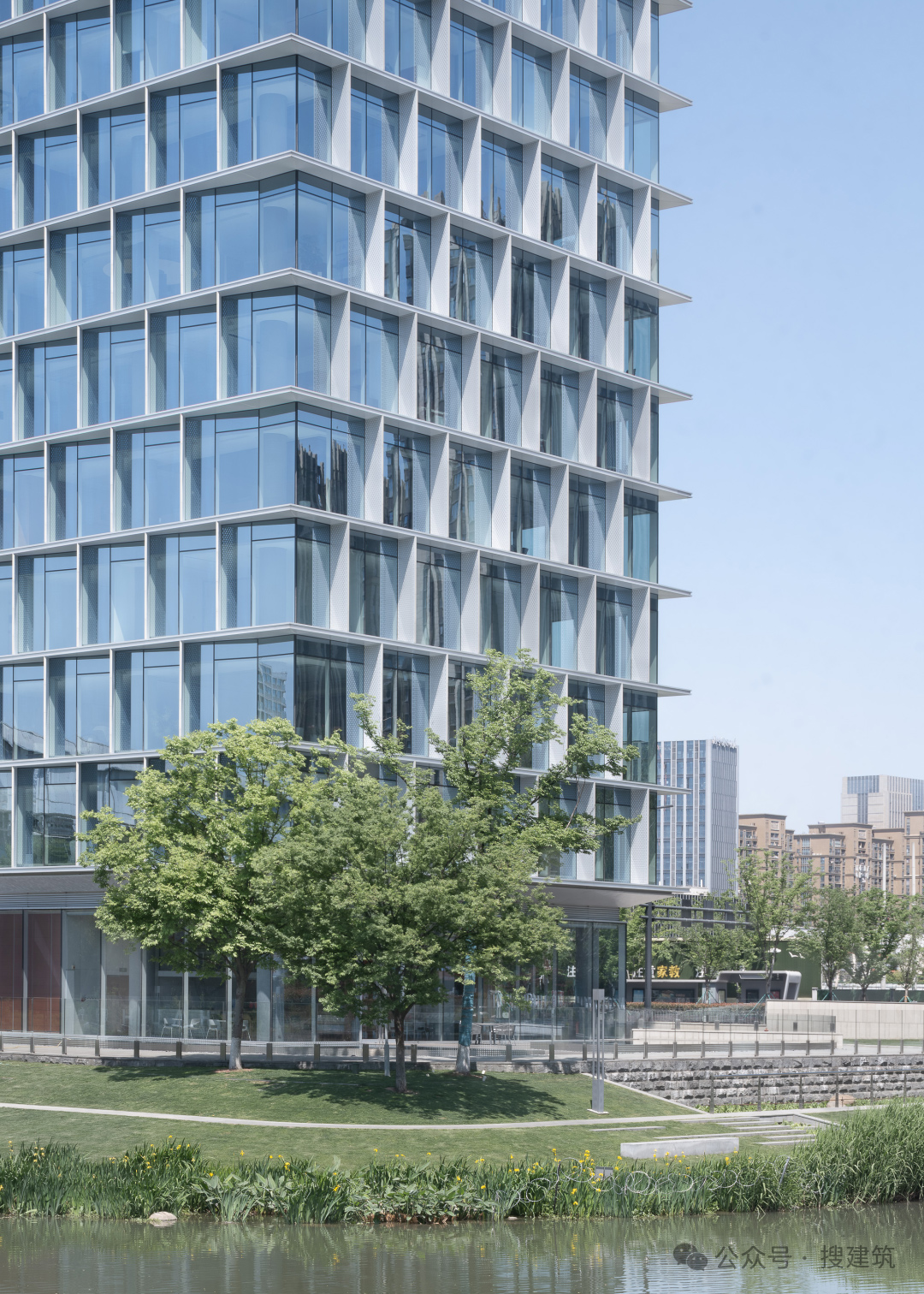 外立面的穿孔鋁板設(shè)計,同時作為通風(fēng)口與遮陽板。錯落的排列打破立面的規(guī)整感,與西側(cè)河面的靈動形成呼應(yīng)。