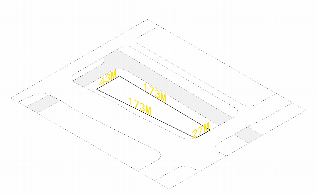 項(xiàng)目用地為非標(biāo)準(zhǔn)梯形,西邊長約173m,南北邊長僅45m與28m,狹長的場地限制了業(yè)主最初希望打造100m超高層總部大樓的愿。