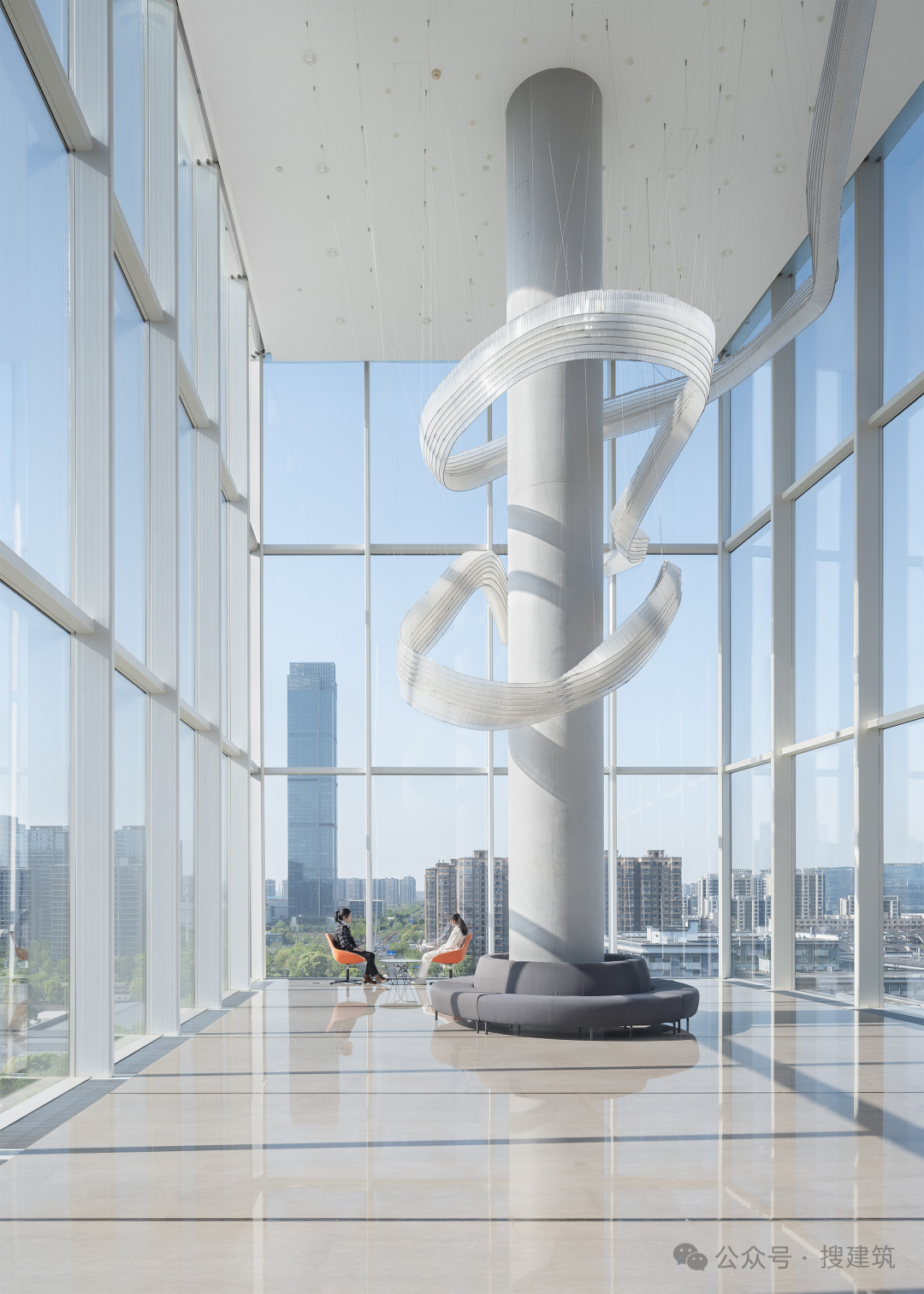 這樣的結(jié)構(gòu)系統(tǒng)實(shí)現(xiàn)了最少梁柱量,主辦公區(qū)僅需一組對柱,北側(cè)通高空間也僅需一根柱子,實(shí)現(xiàn)內(nèi)部空間的開闊通透的同時,為空間使用的靈活性和豐富空間模式的探索提供了更多可能