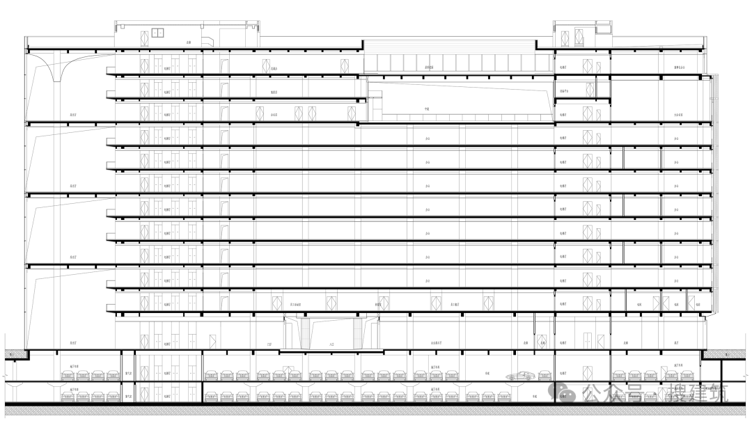 合宜的結(jié)構(gòu)設(shè)計為空間概念的實(shí)現(xiàn)提供了良好支撐。針對15m×115m的狹長平面體量,建筑采用 “橋” 式結(jié)構(gòu)體系:位于兩端的豎向交通核如 “橋墩” 般承受大分受力,辦公區(qū)則如同 “橋面” 延展于橋墩之間。