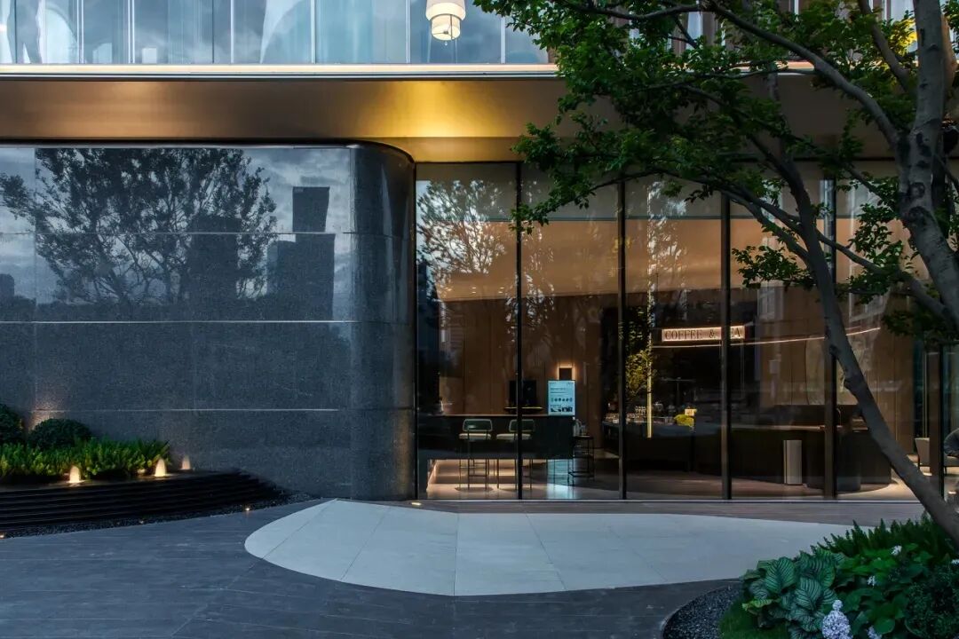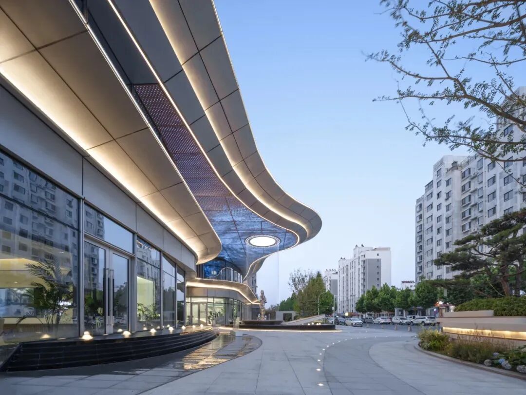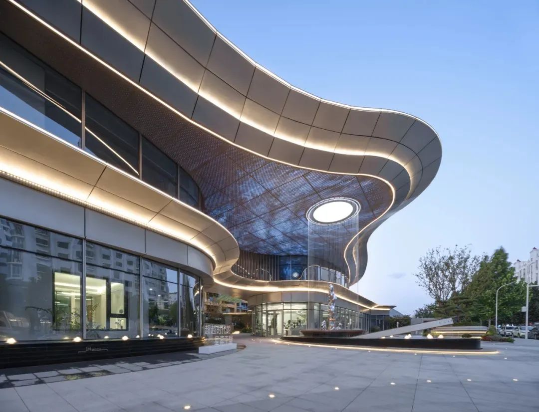 建筑主入口的圓角呈現(xiàn)的是一種打開的姿態(tài),將自然彎曲曲線融入立面,超9米外挑曲線造型,超大挑高,強(qiáng)化了酒店式禮遇感。