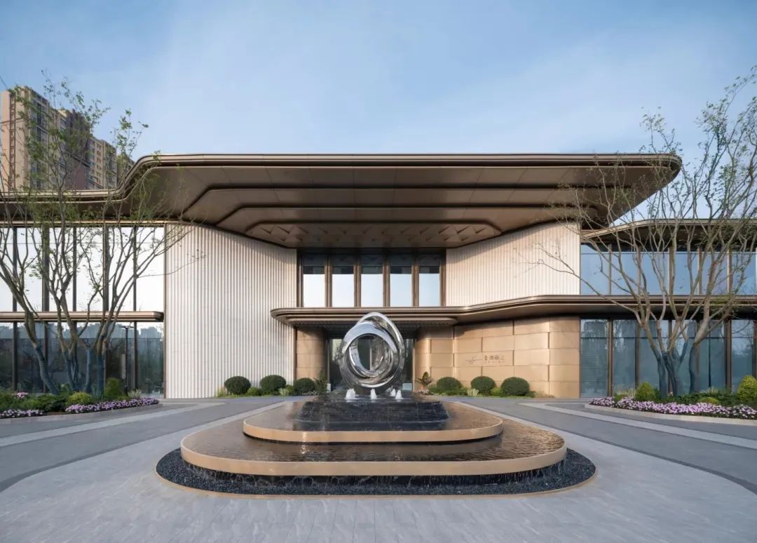 設(shè)計(jì)團(tuán)隊(duì)根據(jù)區(qū)域背景進(jìn)行設(shè)計(jì),提取建筑形態(tài)和符號(hào),項(xiàng)目示范區(qū)售樓處建筑采用對(duì)稱的形體構(gòu)圖,一層灰色石材、古銅色鋁板及金屬線條的使用,營(yíng)造出酒店般奢華尊貴感受;二層弧面玻璃、淺色鋁板又形成輕盈時(shí)尚的氣質(zhì)。