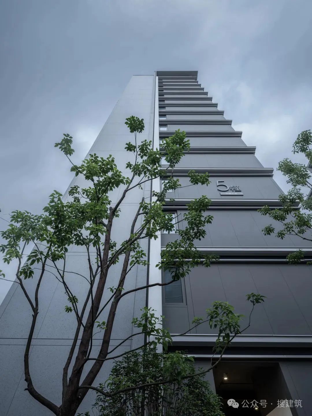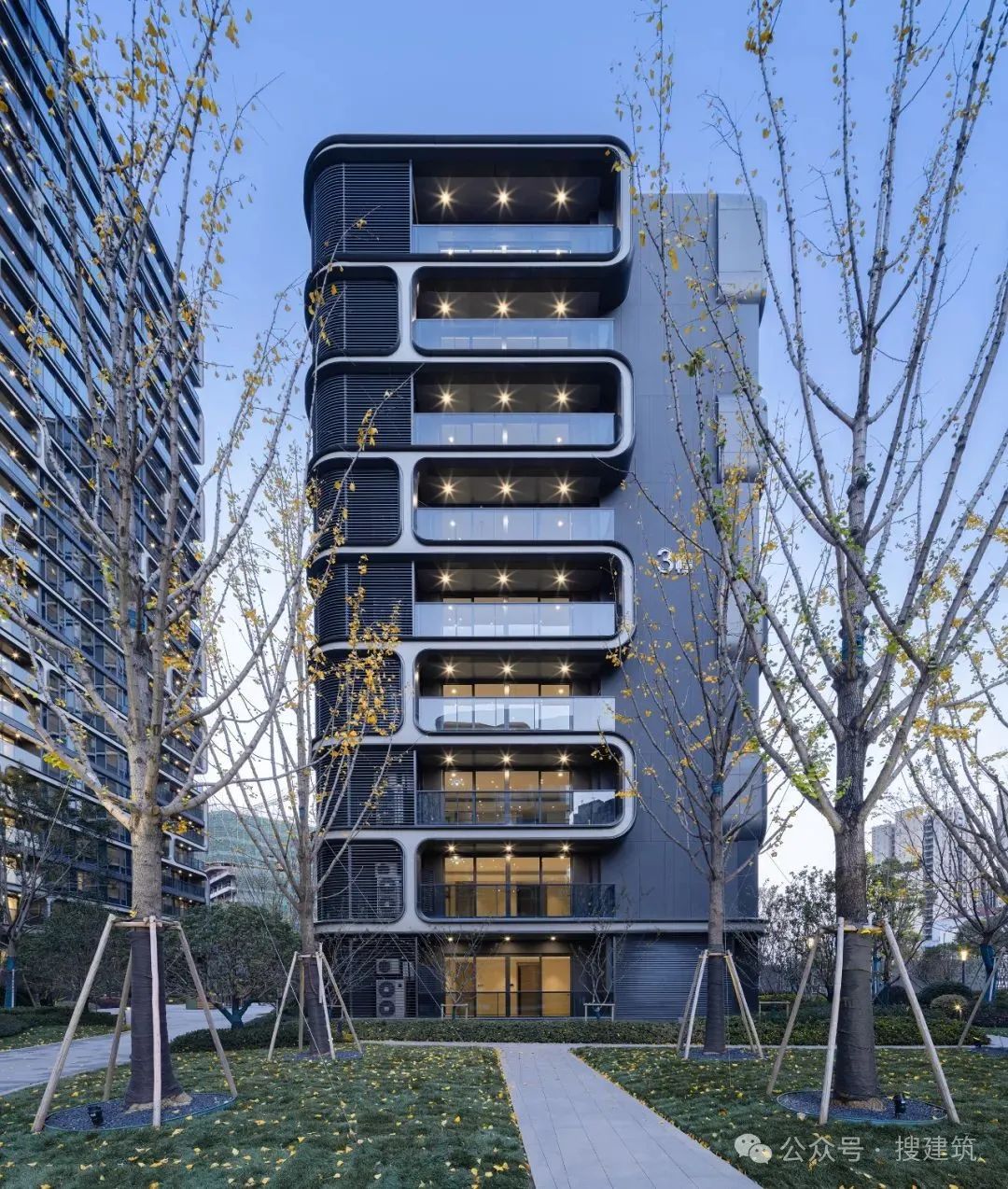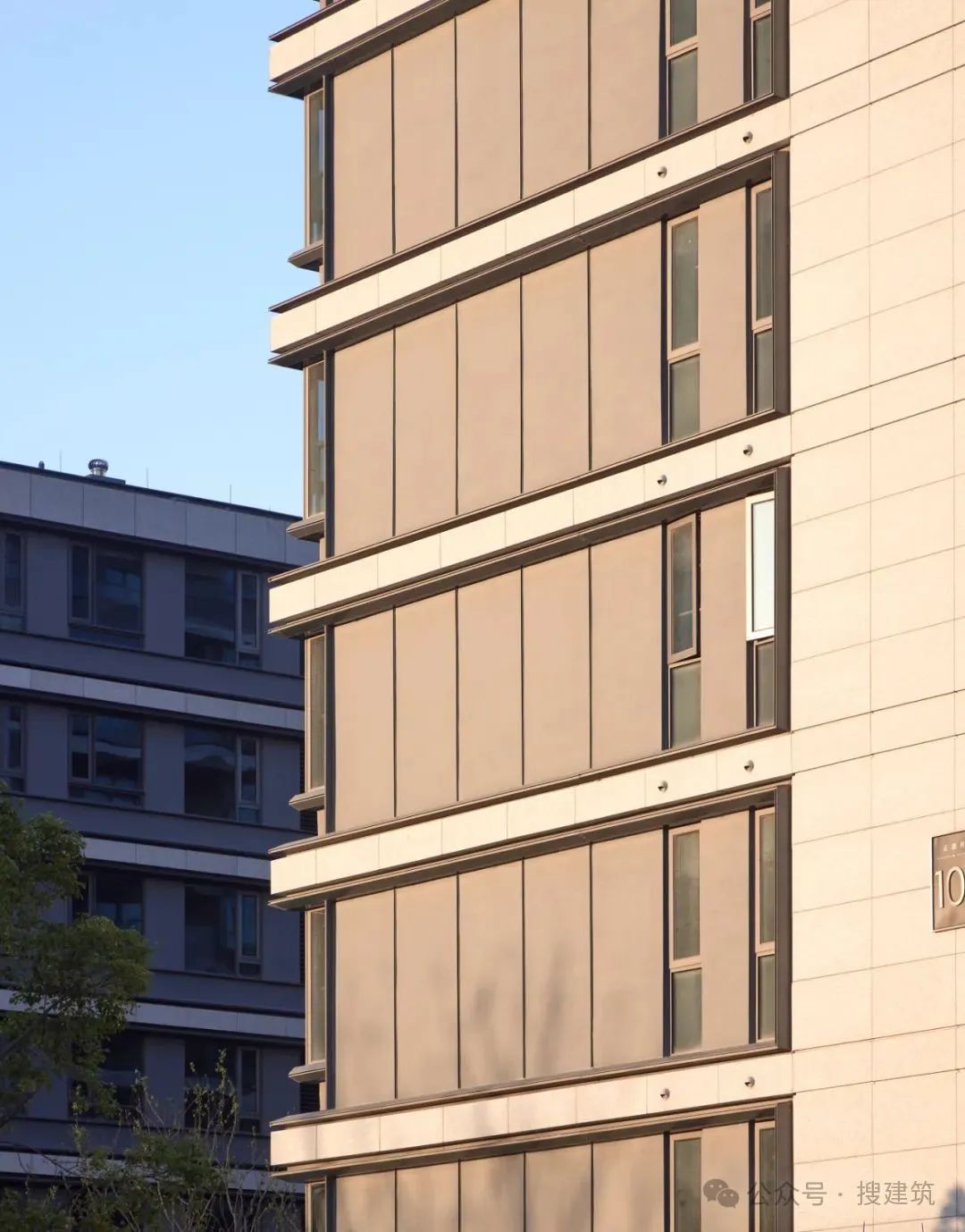 潤達豐控股 濱江·天樾建筑側(cè)面采用米黃色真石漆與深灰色涂料和深灰色穿孔鋁板結(jié)合,虛與實的對比將建筑映襯得干凈、純粹而又輕盈。